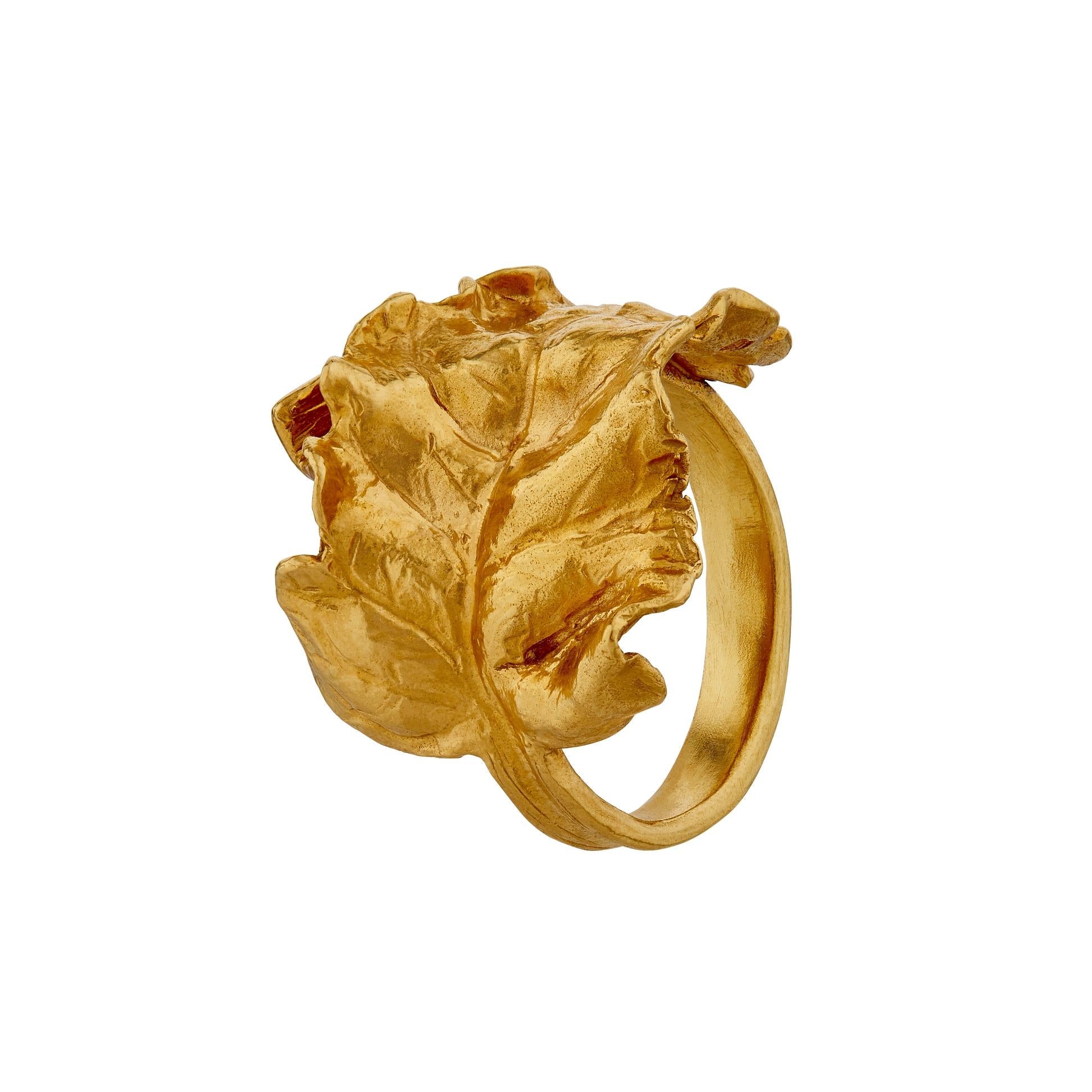 A sculptural chard leaf has been organically curled into a chic statement ring. With careful curving and layered textures, our design team have brought this luscious leaf to life.