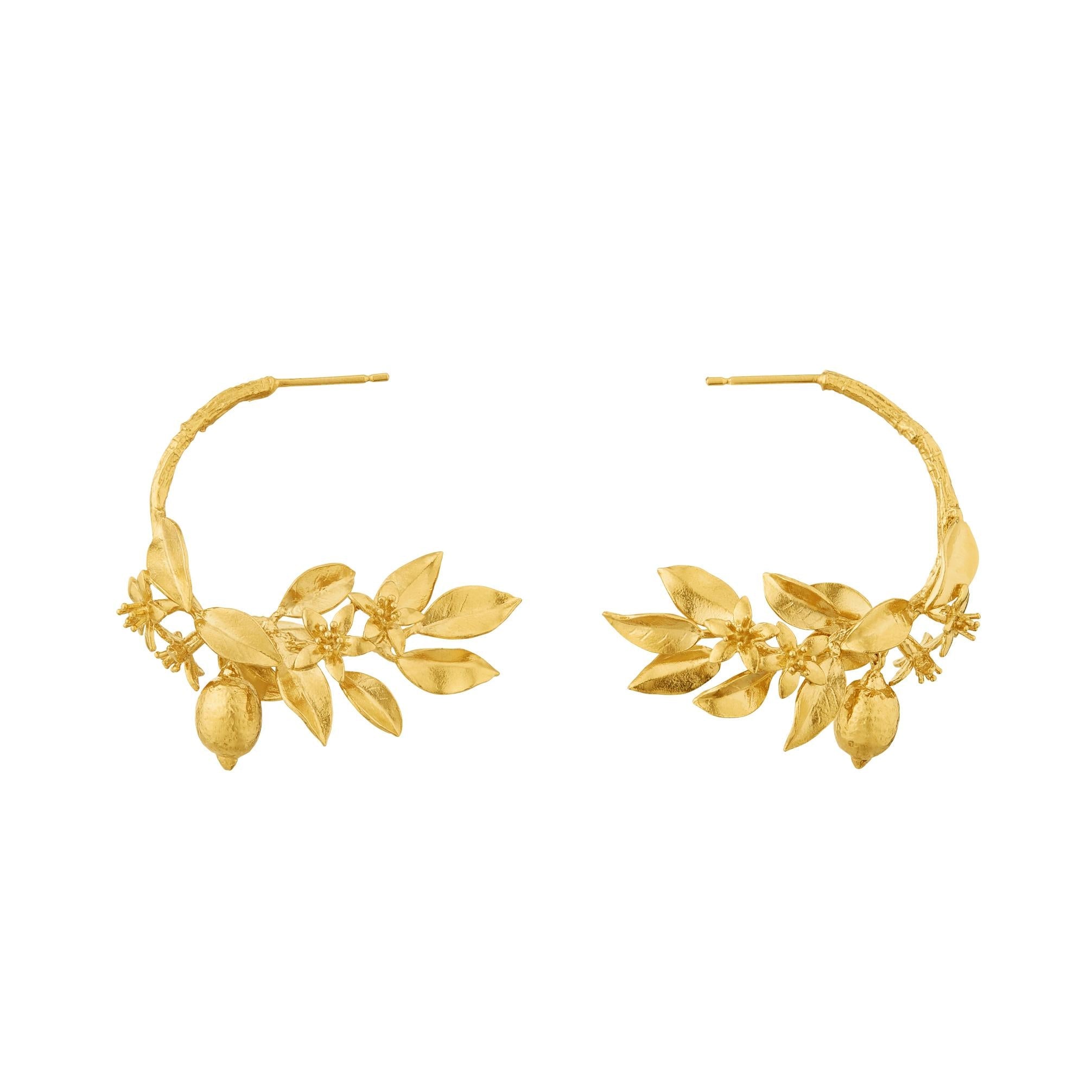 Ripe looking lemons nestled amongst leaves and blossoms move breezily from a textured branch, to form these statement hoop earrings.