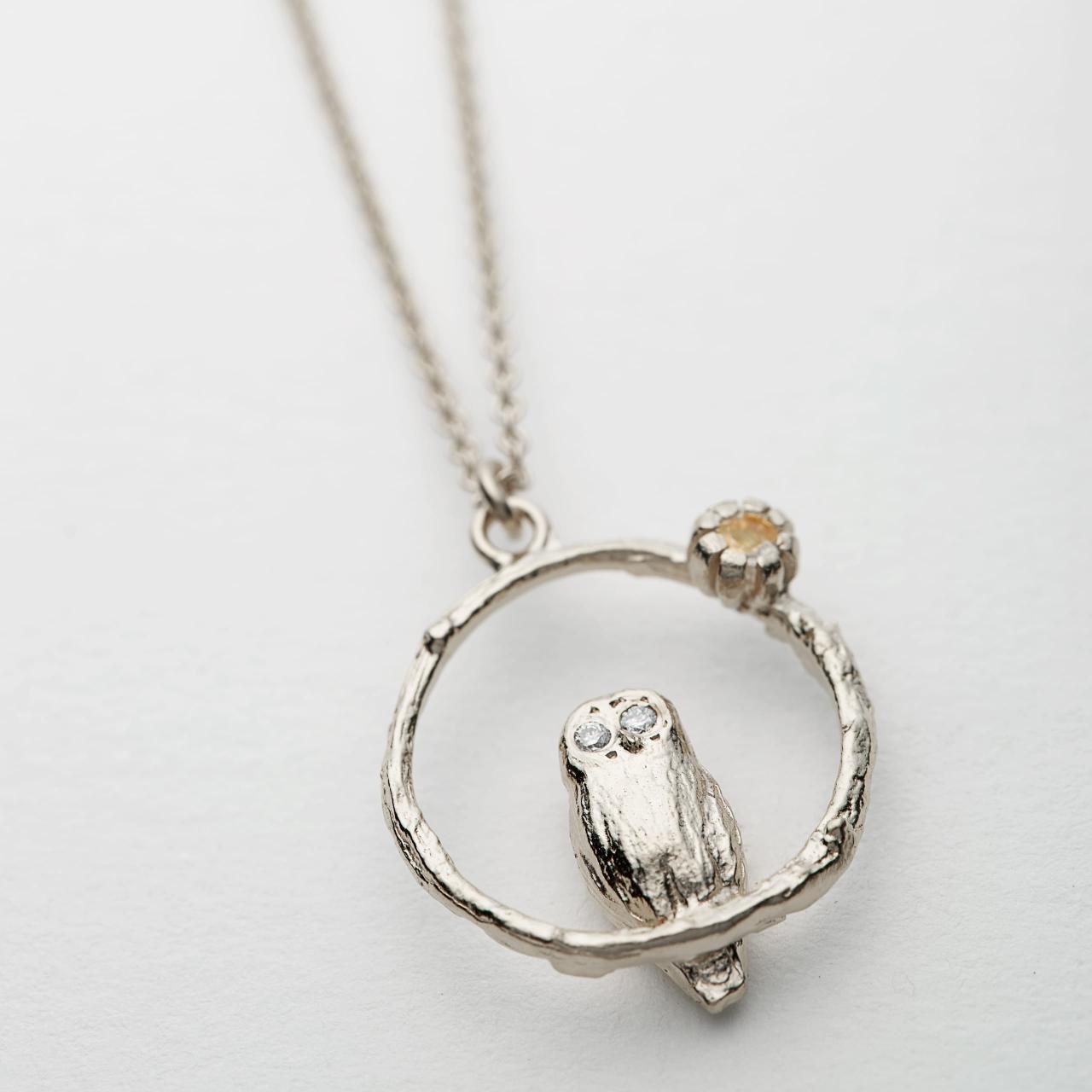 A tiny Owl with piercing moonstone eyes gazes through the trees in this charming loop necklace featuring a white diamond.