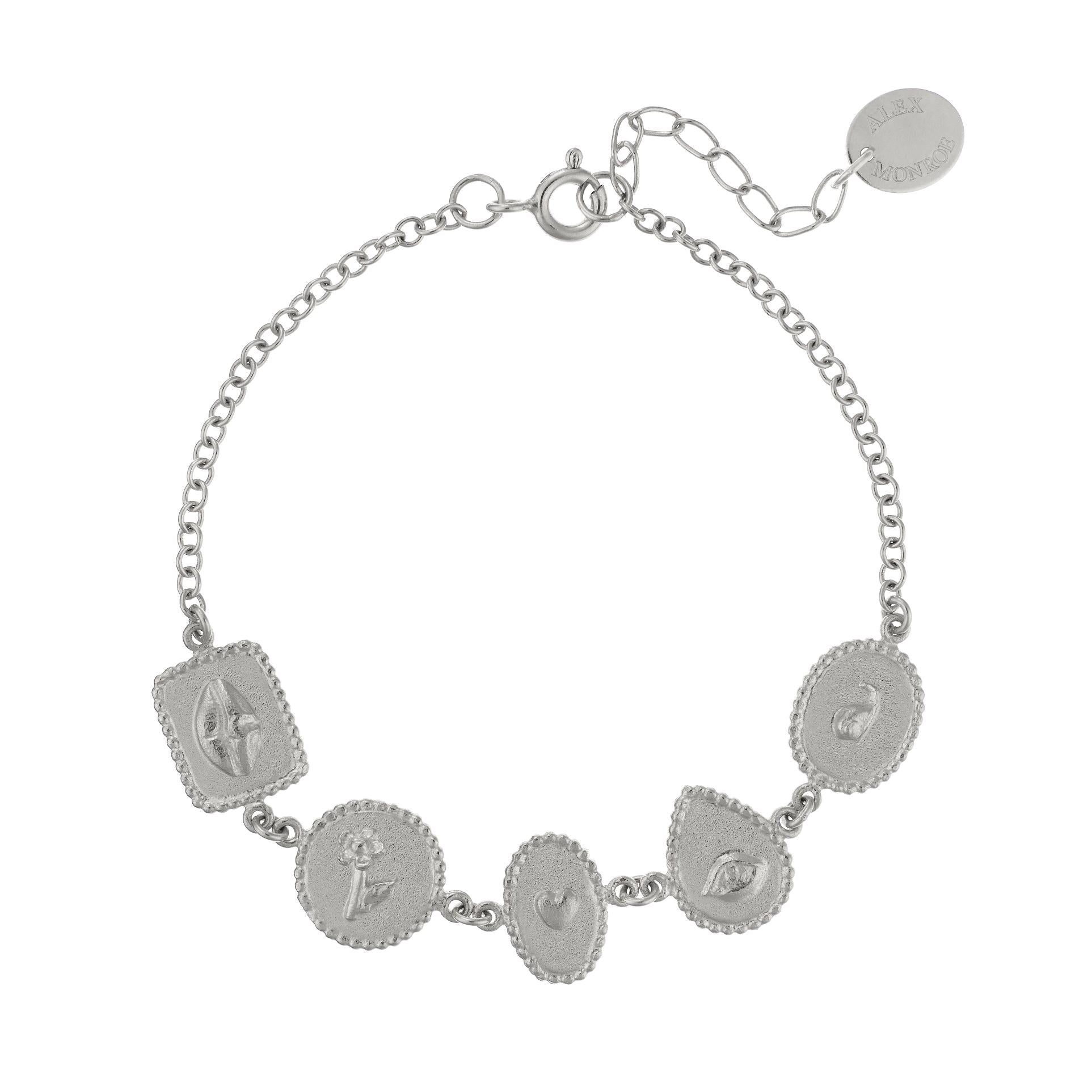 Intricate Ex-voto tokens are linked to form this sweet station bracelet in celebration of the senses and as an expression of gratitude to nature. A mix of intricate Ex-voto inspired tokens are linked to form a delicate bracelet that celebrates the five senses, and is a wearable reminder to stay connected to our natural environment.