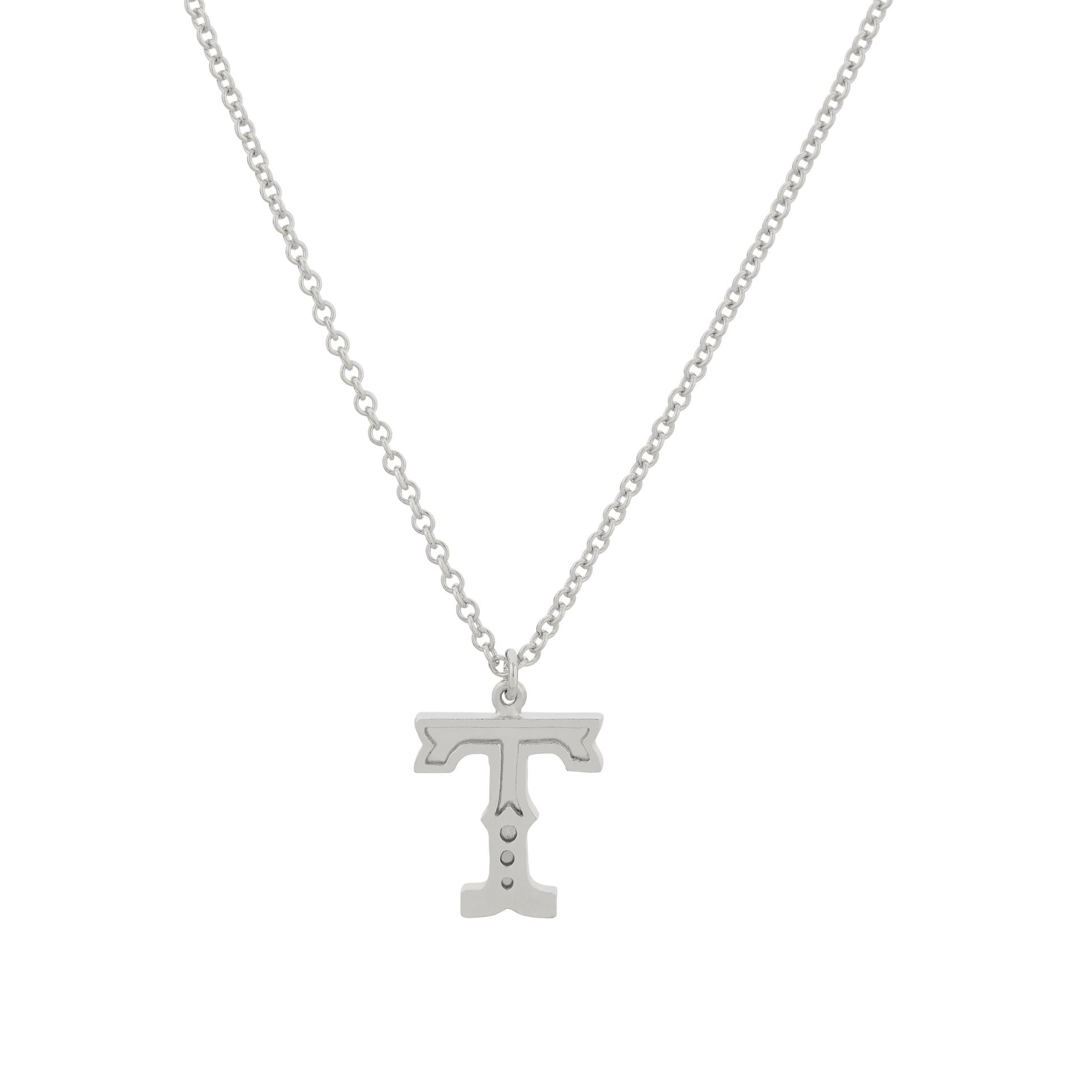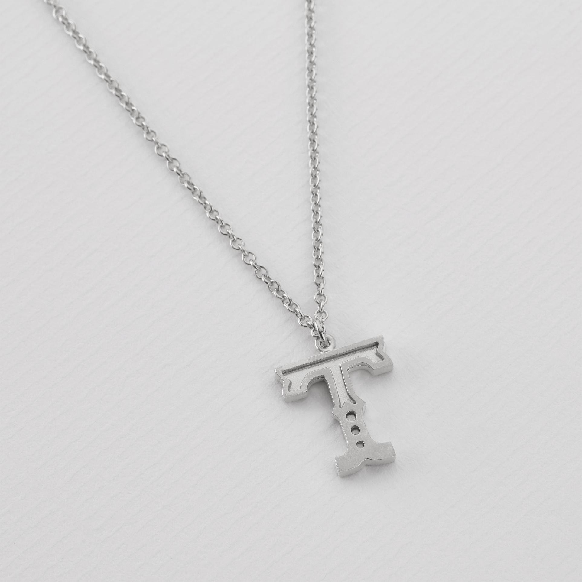 Formed in a nostalgic, graphic style, this letter ‘T’ necklace celebrates the skill and craftsmanship found in the hand-painted signs of yesteryear. All of the letters and symbols for ‘Just my Type’ were created in two layers, giving each design depth and detail.