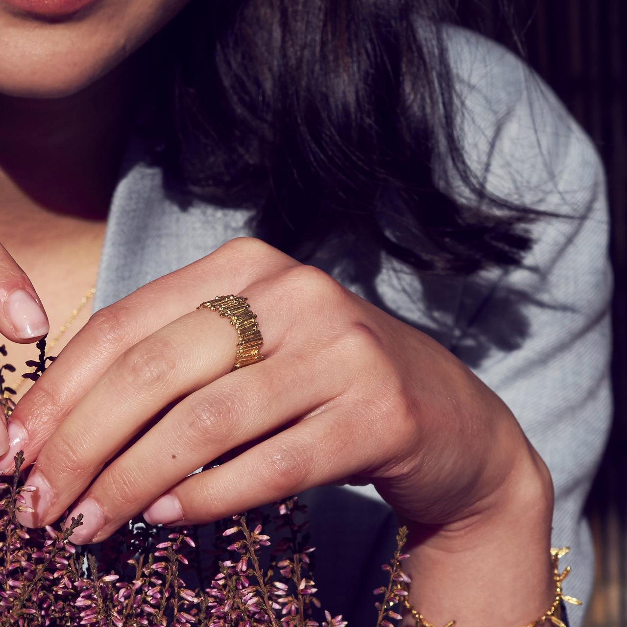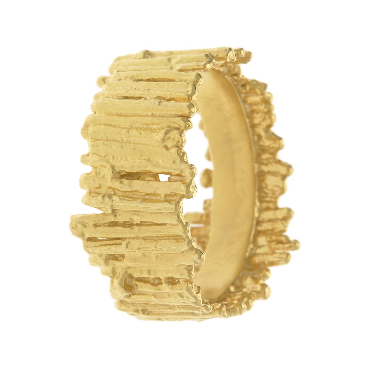 The layered and ridged structure of an ancient tree trunk inspired this organic wide band ring.