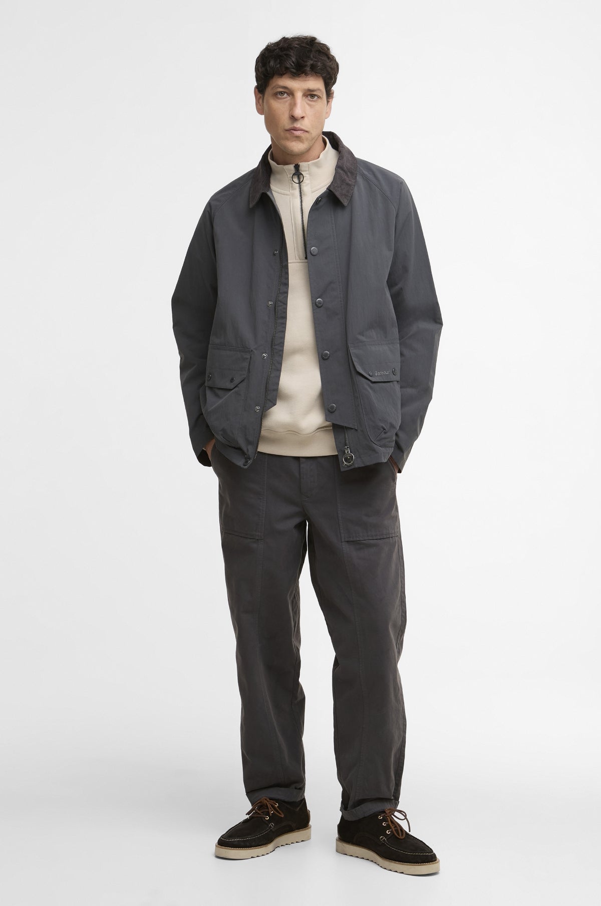 It doesn't get more timeless than a Barbour jacket. The Re-Engineered Casual Chore Jacket is a reworked contemporary version of the quintessential Barbour jacket style. The casual chore jacket features a cleaner silhouette with only 2 hand pockets and a boxy fit. Constructed in peached cotton/poly which is unlined and lightweight ideal for spring.