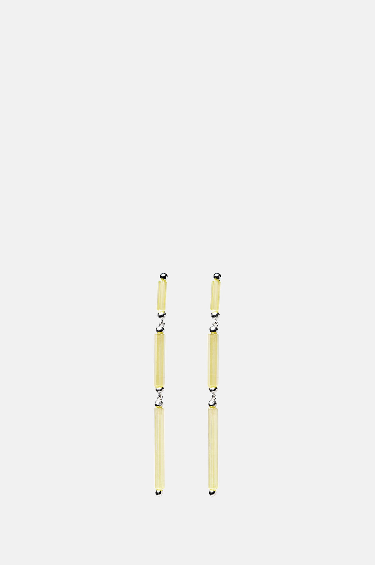 - Long drop earrings composed of three cylinders of yellow satin crystal
