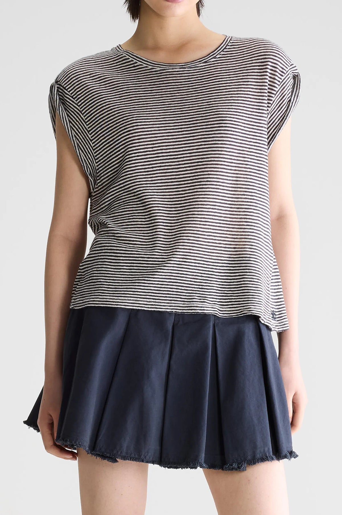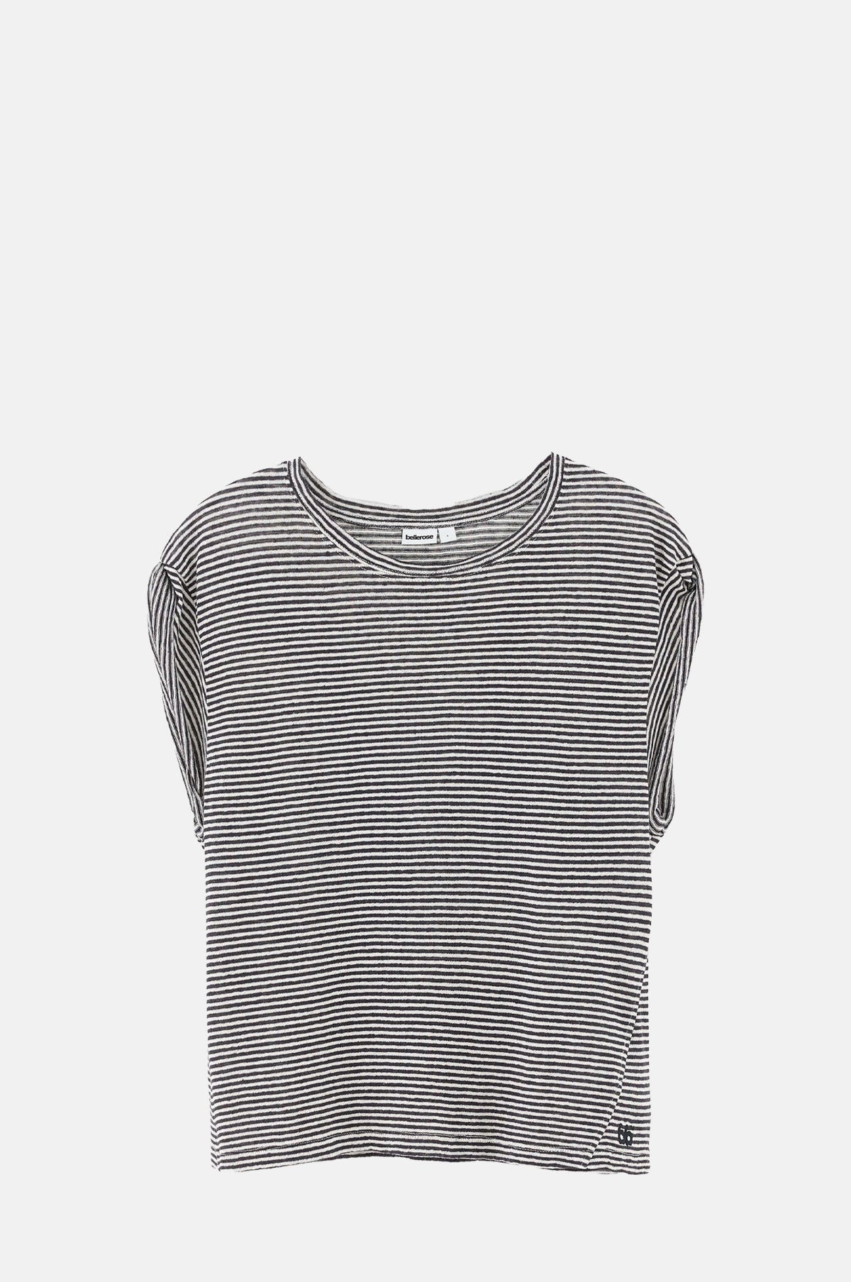 Lovely and slouchy this soft grey and white striped t-shirt from Bellerose has a round neck and loose, super short sleeves. Slightly sheer it is great for layering over a tank top and will keep you cool in hot weather.