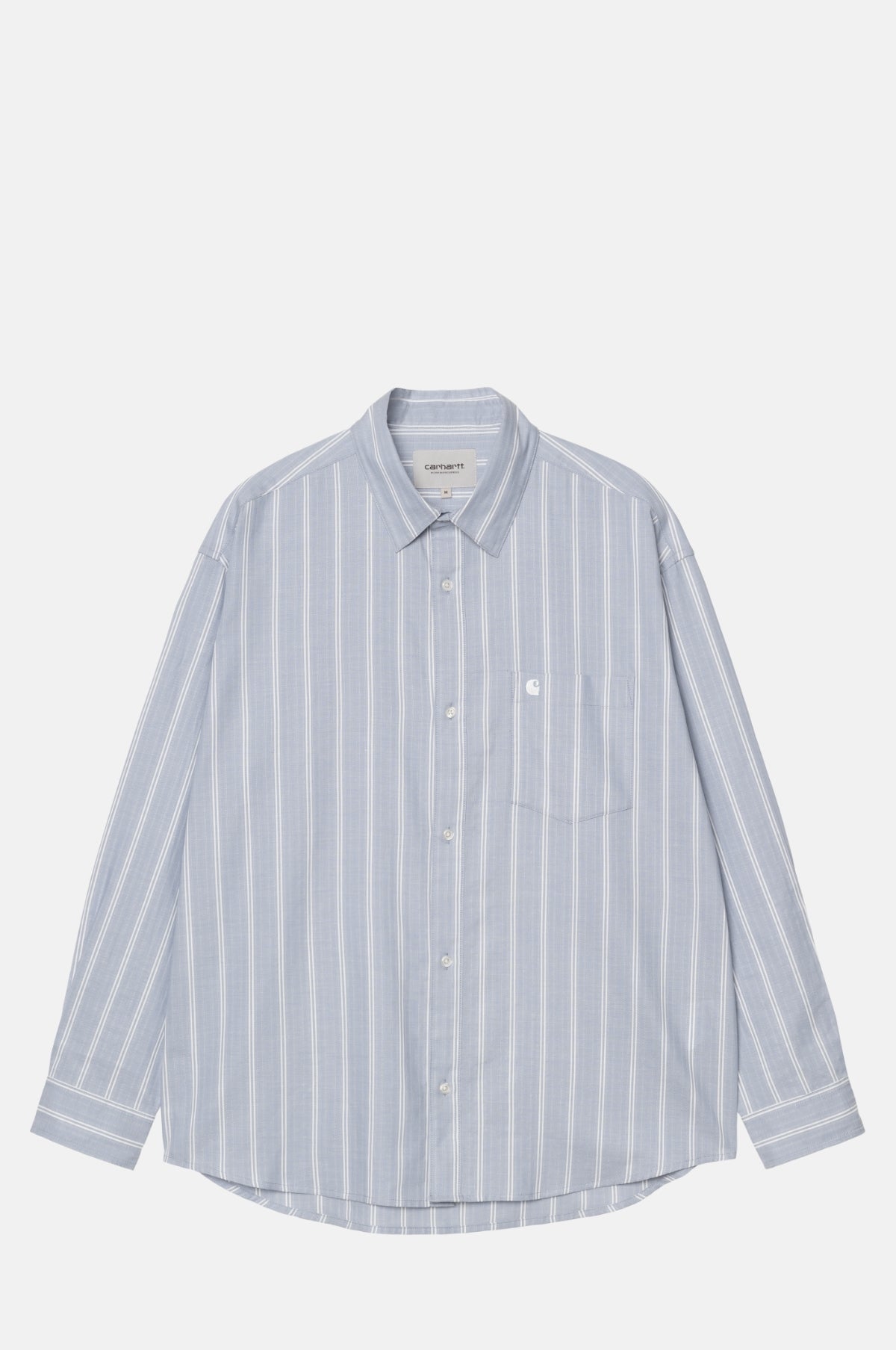 The L/S Beale Shirt in Gentle Blue / White is a lightweight and long-sleeve style, coming in a loose fit and is made from lightweight cotton dobby with a blue and white stripe. It has a regular collar and logo embroidery on the left chest pocket.