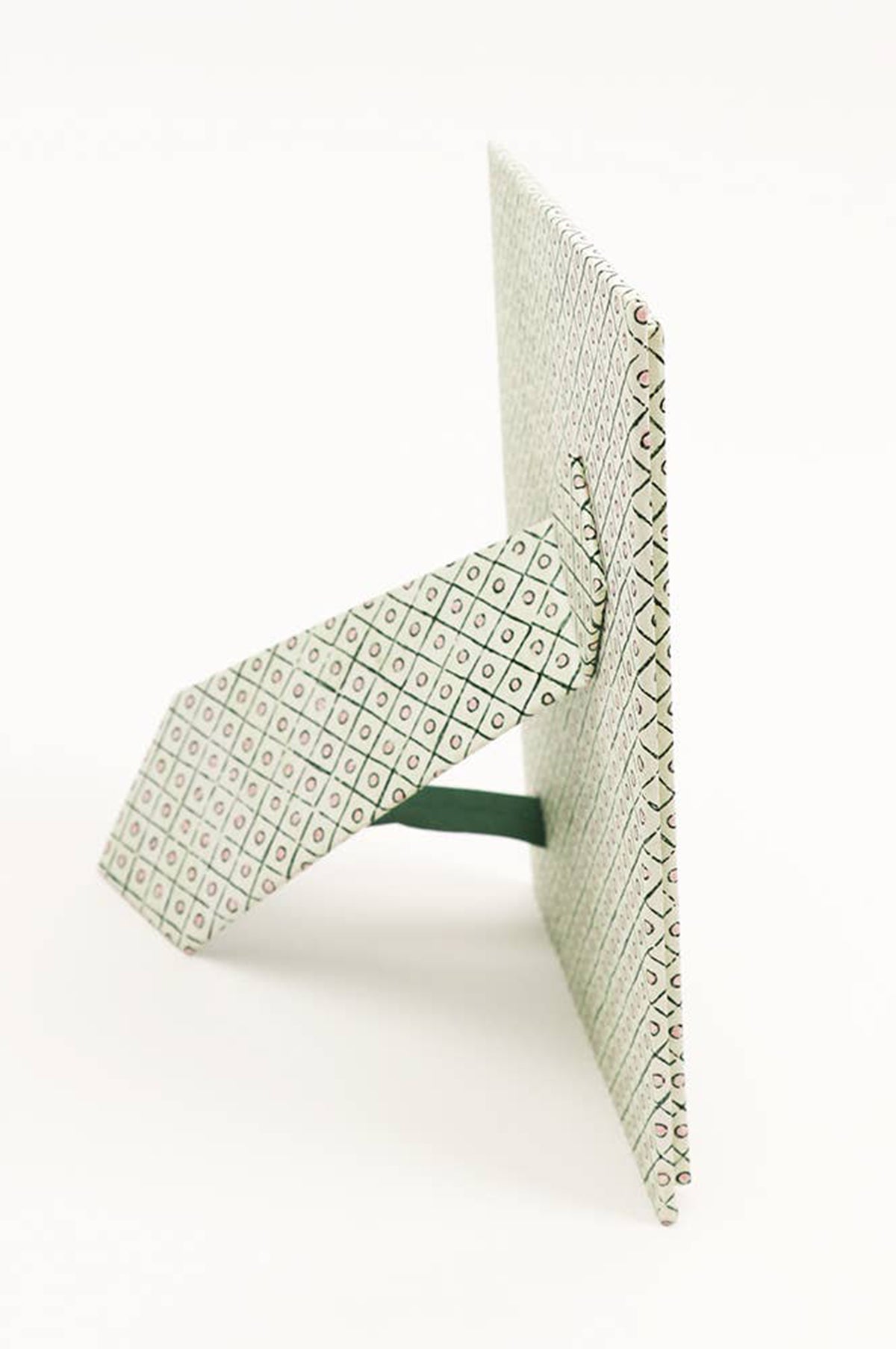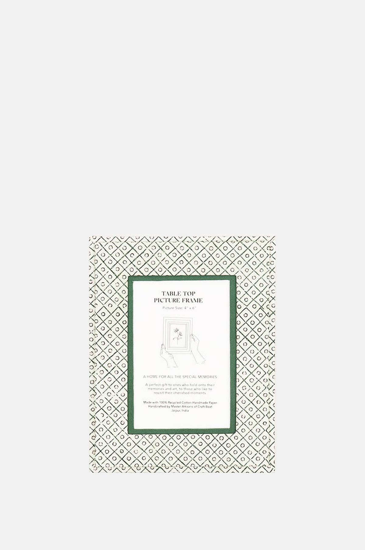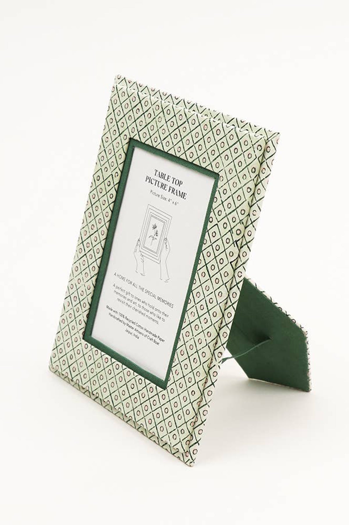 Craft Boat recycled cotton standing picture frames are handmade by master artisans who have been creating vintage style boxes and cartonage products for generations in Jaipur. This beautiful paper design featuring a dot and grid pattern in shades of green and pink has been hand block printed. This would make a perfect gift for those who hold onto and display their memories and art, to let them revisit their cherished moments.