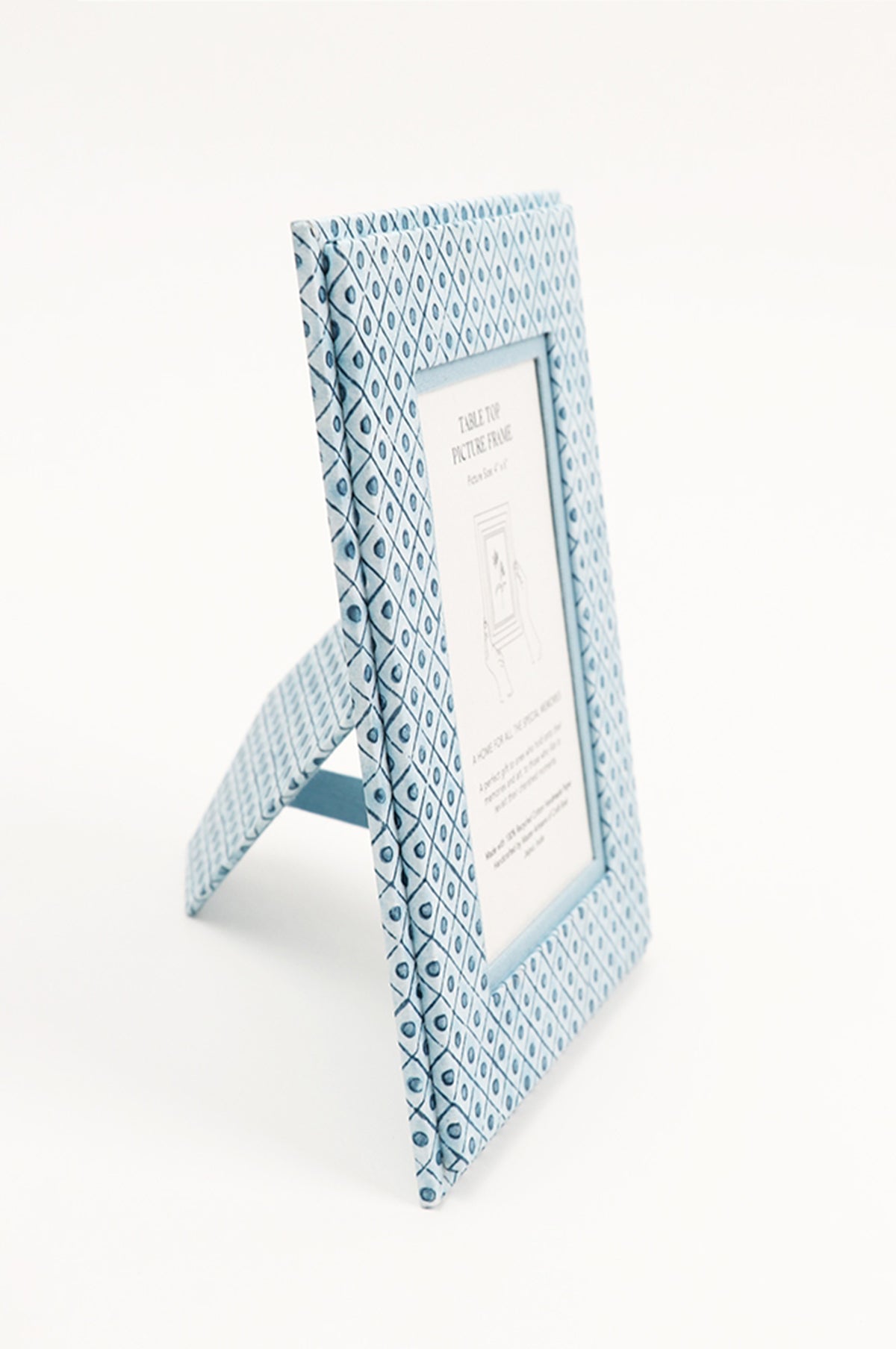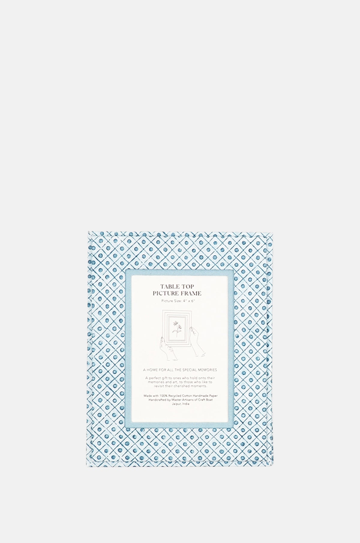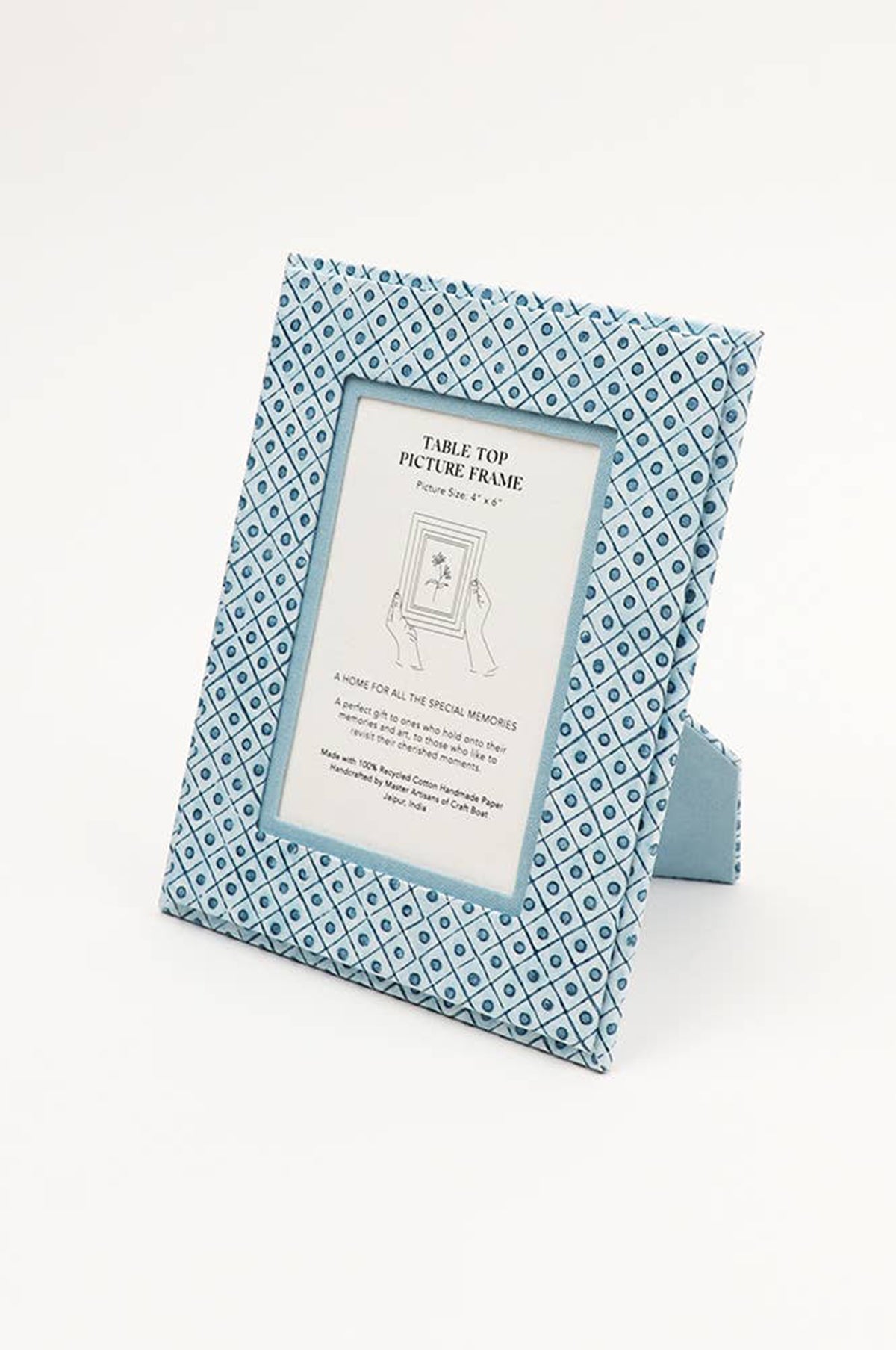 Craft Boat recycled cotton standing picture frames are handmade by master artisans who have been creating vintage style boxes and cartonage products for generations in Jaipur. This beautiful paper design featuring a dot and grid pattern in shades of blue and off white has been hand block printed. This would make a perfect gift for those who hold onto and display their memories and art, to let them revisit their cherished moments.