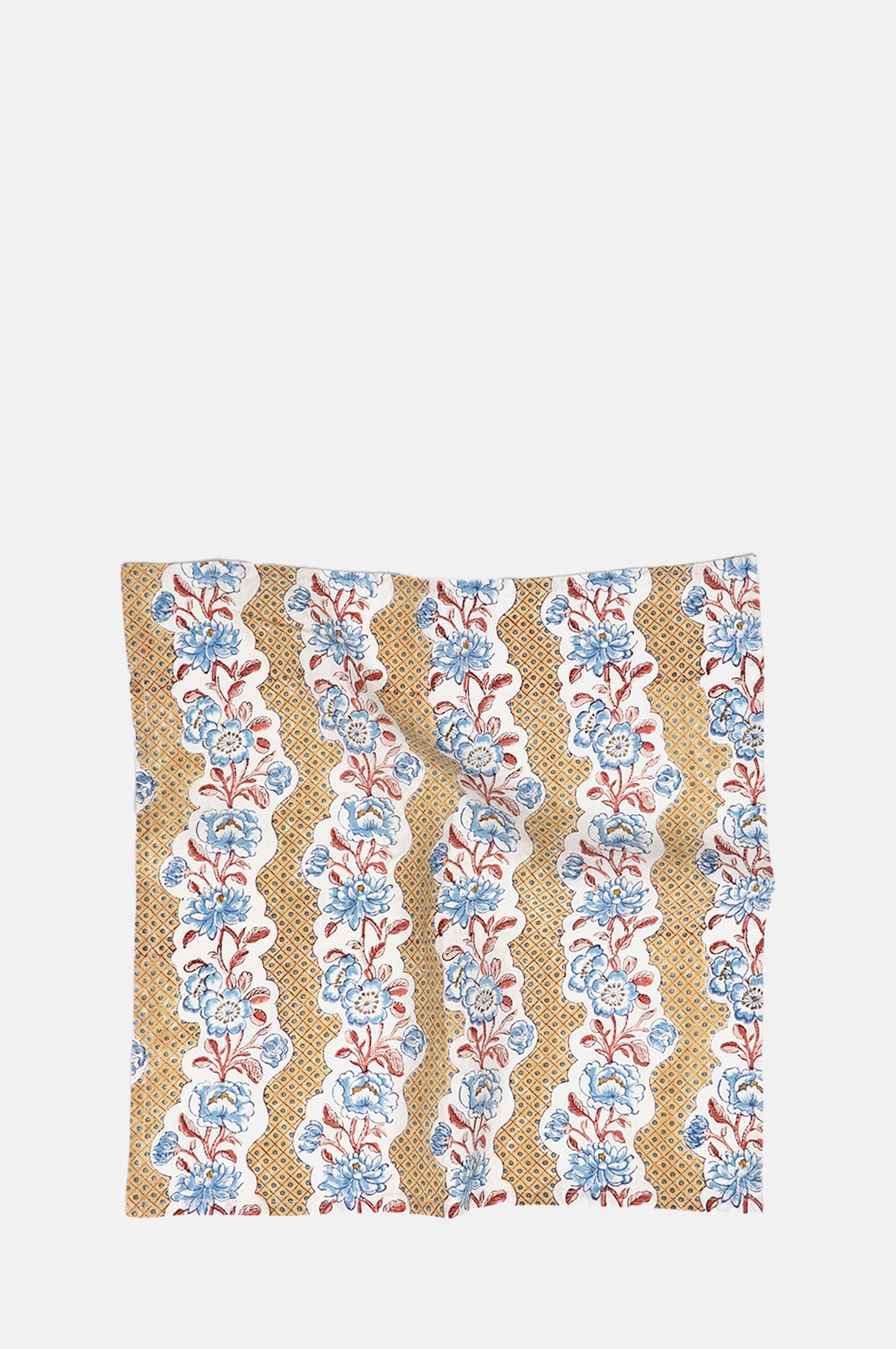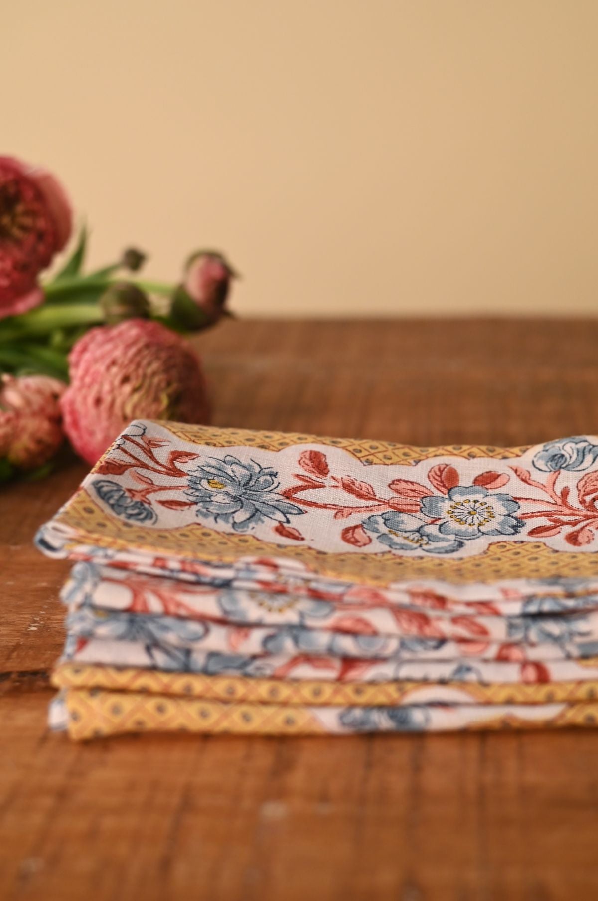 These beautiful hand block printed napkins feature a yellow background with a red and blue blooming floral trellis design inspired by country living and will give a welcome pop of colour to your table setting.