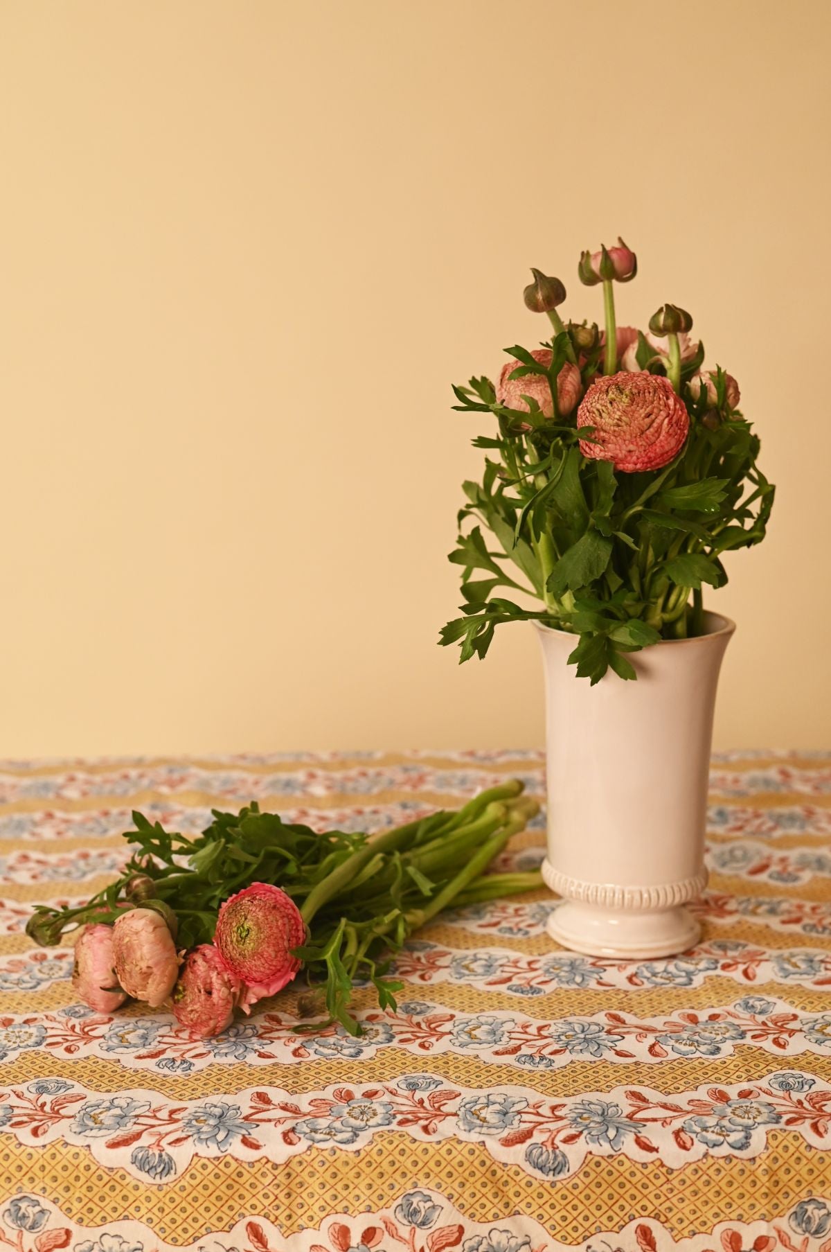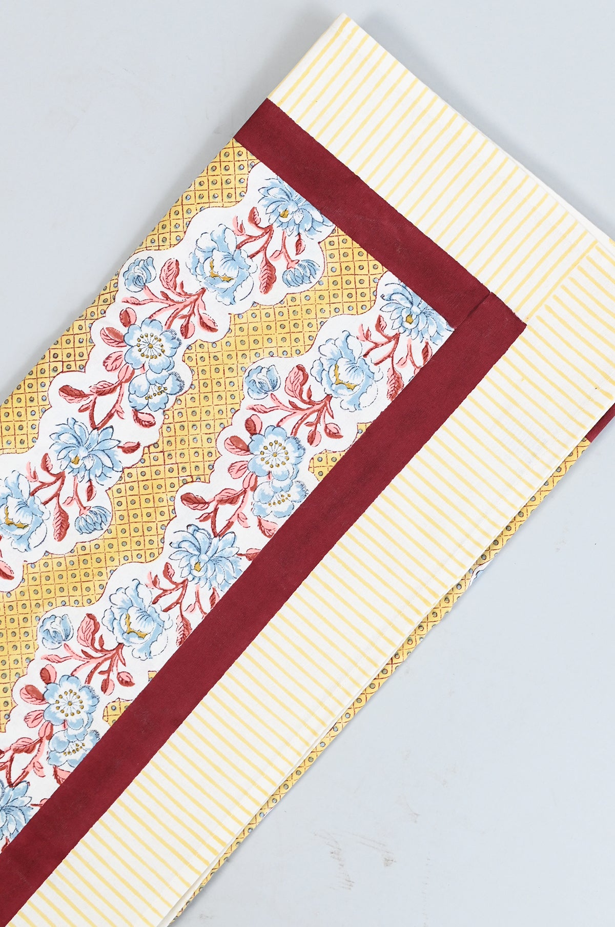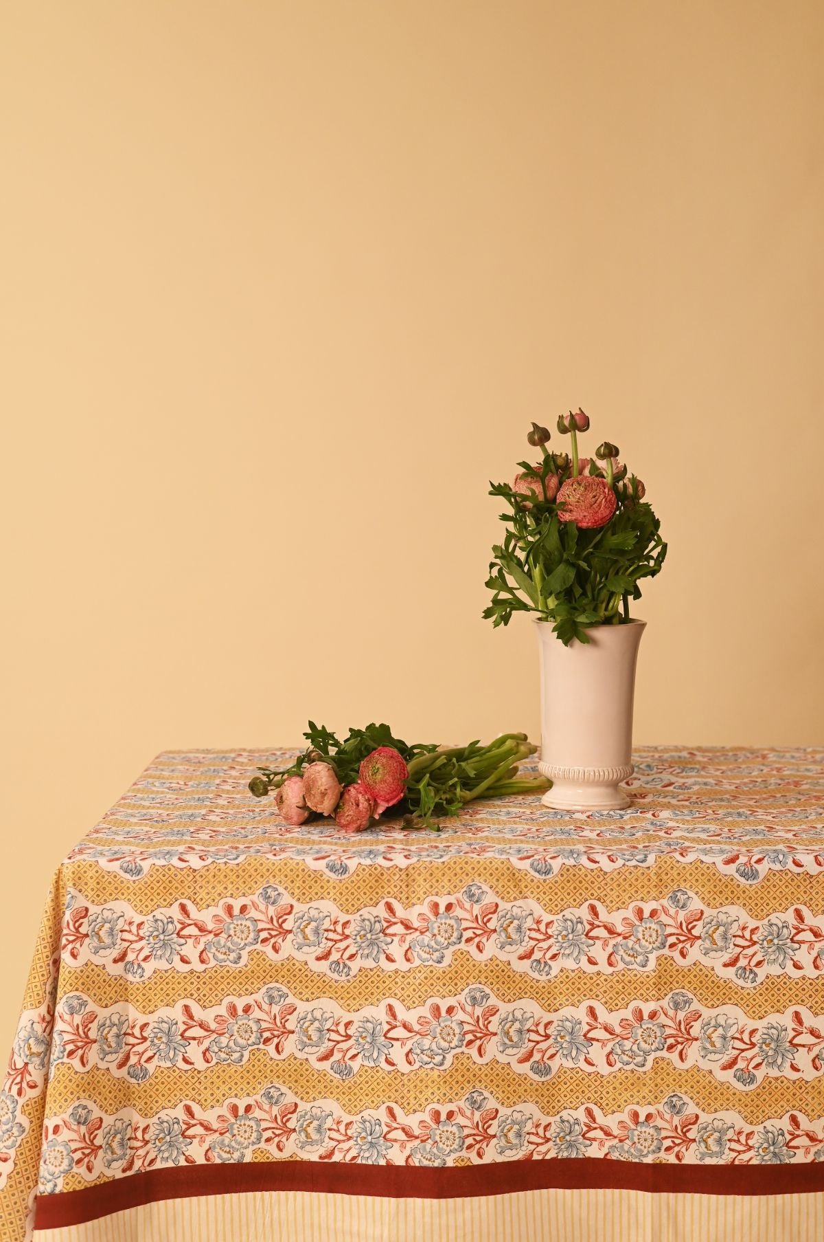 This beautiful hand block printed tablecloth features a yellow background with red and blue blooming floral trellis design inspired by country living and will give a welcome pop of colour and pattern to your table setting.
