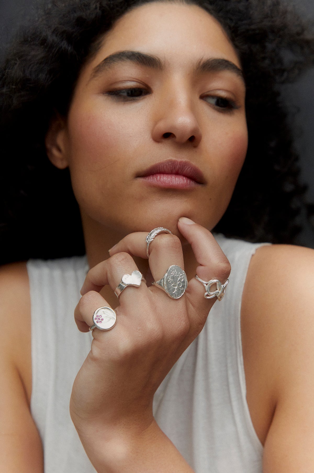 This beautifully shaped silver ring features a large top disc etched with a beautiful bouquet of flowers. Unusual and exceedingly charming, this is a stunning ring with the vintage and modern aesthetic.