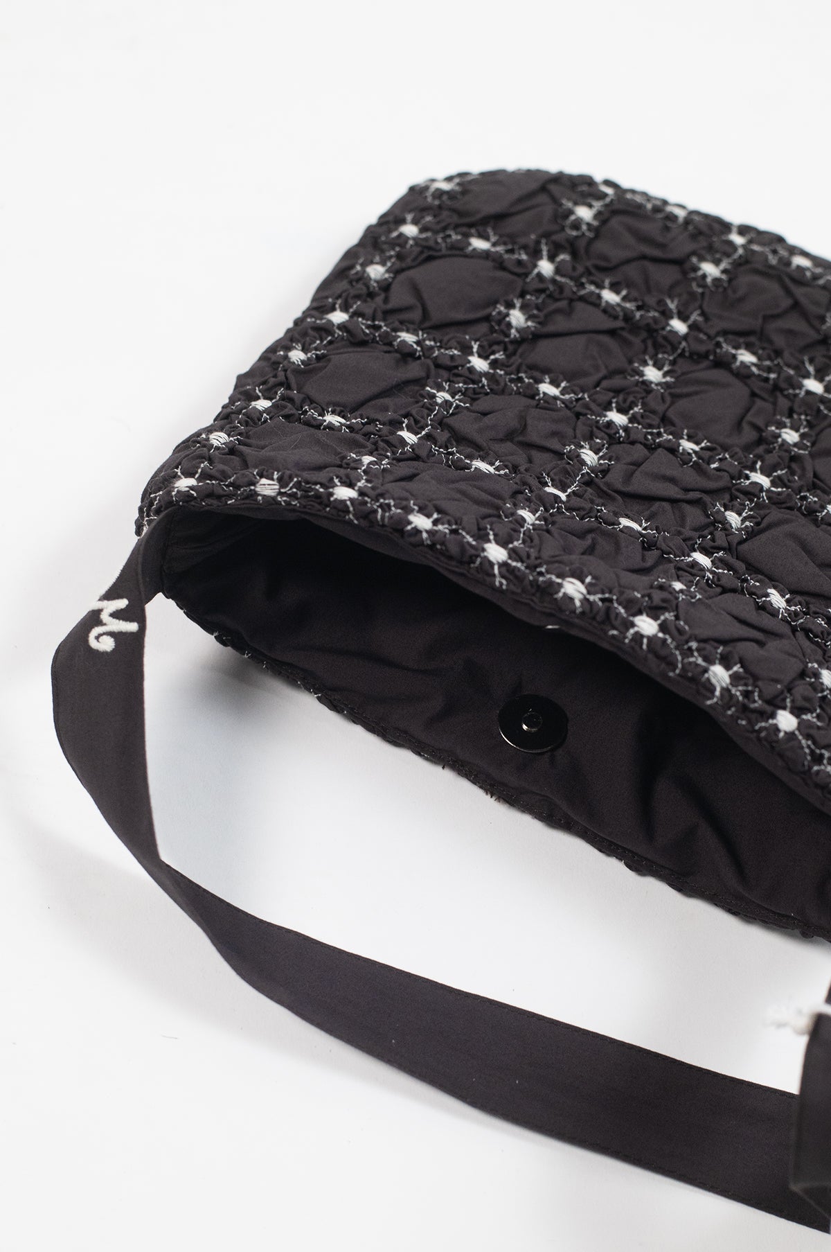 Pretty, playful and practical, this black and white shirred shoulder bag from Damson Madder will make a fun addition to any outfit. Square shaped, it has a magnetic button closure and internal slip pocket. Easy to style it can be worn over the shoulder, or carried by hand making it a versatile piece that easily transitions from day to night.