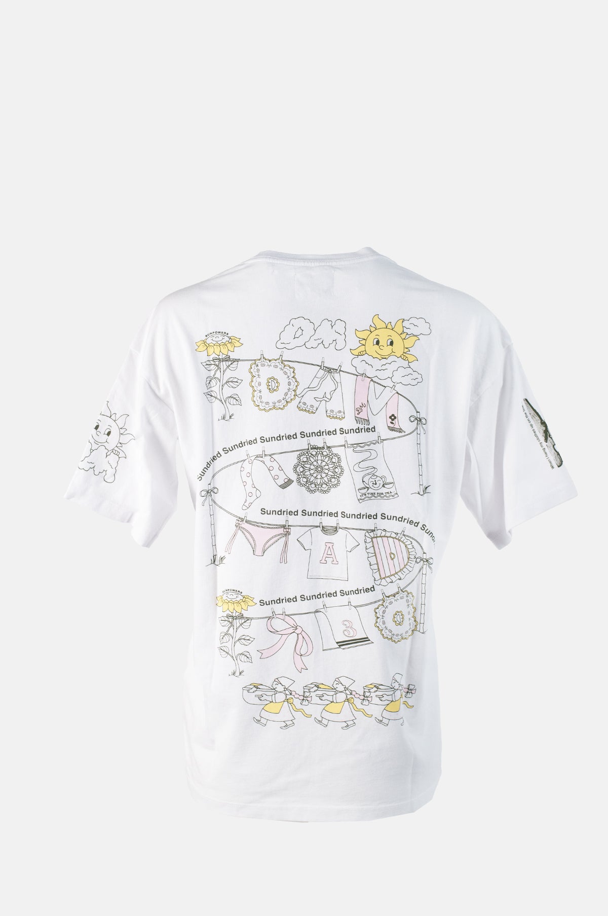 Is there a better feeling than pegging the laundry on the line whilst the sun beats down on you? This simple pleasure is celebrated on this white oversized, boyfriend t-shirt with thoughtfully placed graphic prints on the front, back and sleeves. Crafted from 100% organic cotton, this is the go-to piece you'll reach for every day.