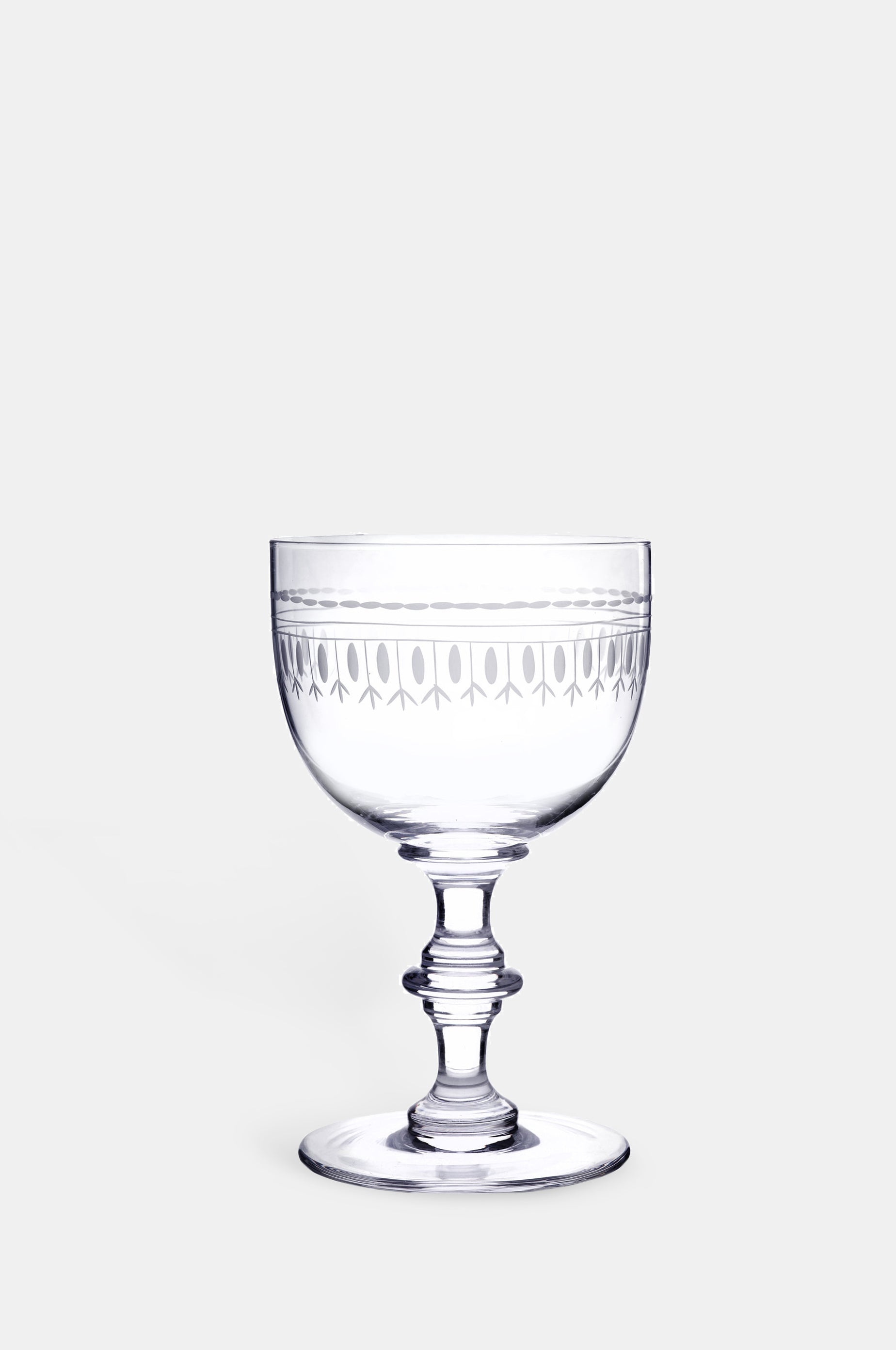 Each glass has been hand-blown and hand-engraved and the wine glasses are made from fine crystal glass. This design features a delicate, engraved oval motif.