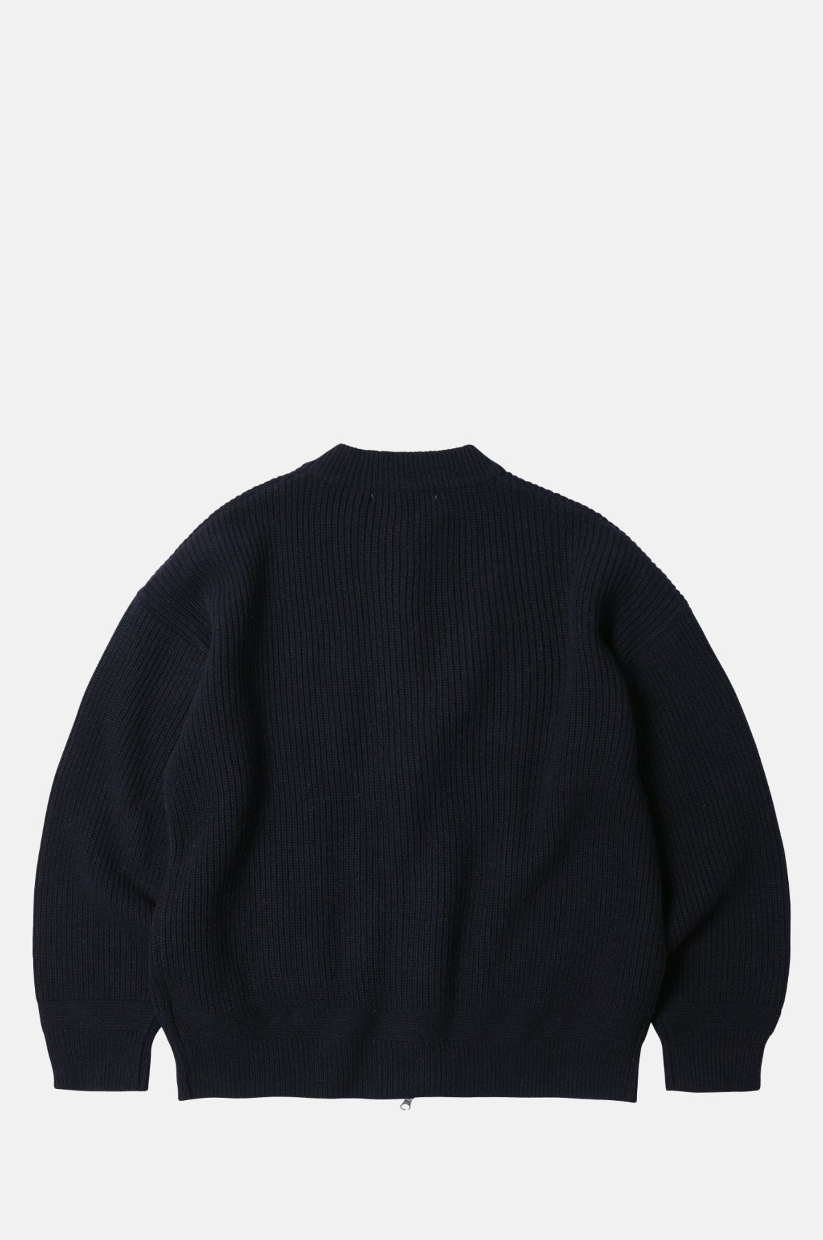 Frizmworks are most well known for their masterful reinterpretation of classic menswear pieces. Hailing from South Korea, they use fabric and fit to create garments that are incredibly wearable whilst being unique. The Wool Deck Zip-up Cardigan in Navy is a heavy ribbed cardigan with a round collar and 2 way zip closure.