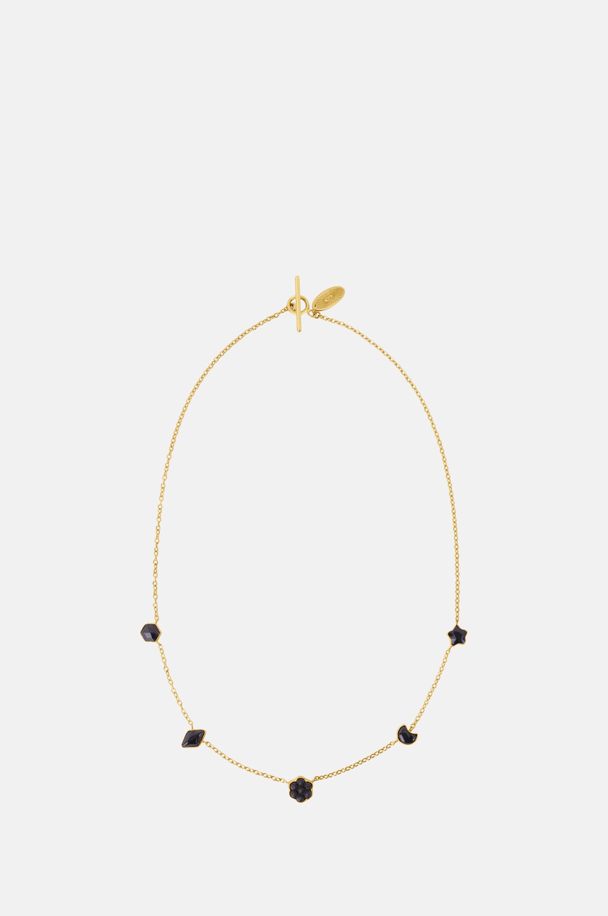 We adore the mid-Victorian feel of this Five Mini Charm Jet Necklace from Grainne Morton. Known for its fine, smooth texture and its striking midnight black colour -the jet and onyx charms on this necklace beautifully offset the glimmer of the simple gold chain. A versatile, mysterious stone - this gorgeous charm necklace will add a bit of glamour and intrigue to any outfit.