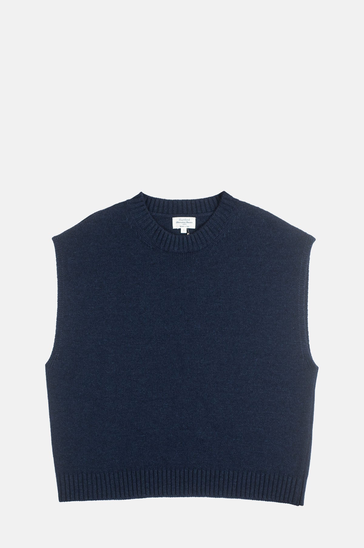 This wonderfully versatile sleeveless navy pullover from Hartford is an invaluable piece for any transitional wardrobe. With a soft hand, this knit has a round neck and ribbed detailing that runs around the collar and hem. With it slightly boxy shape and soft structure, it is ideal to layer over t-shirts, dresses and shirts.