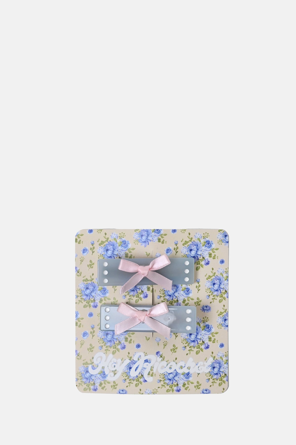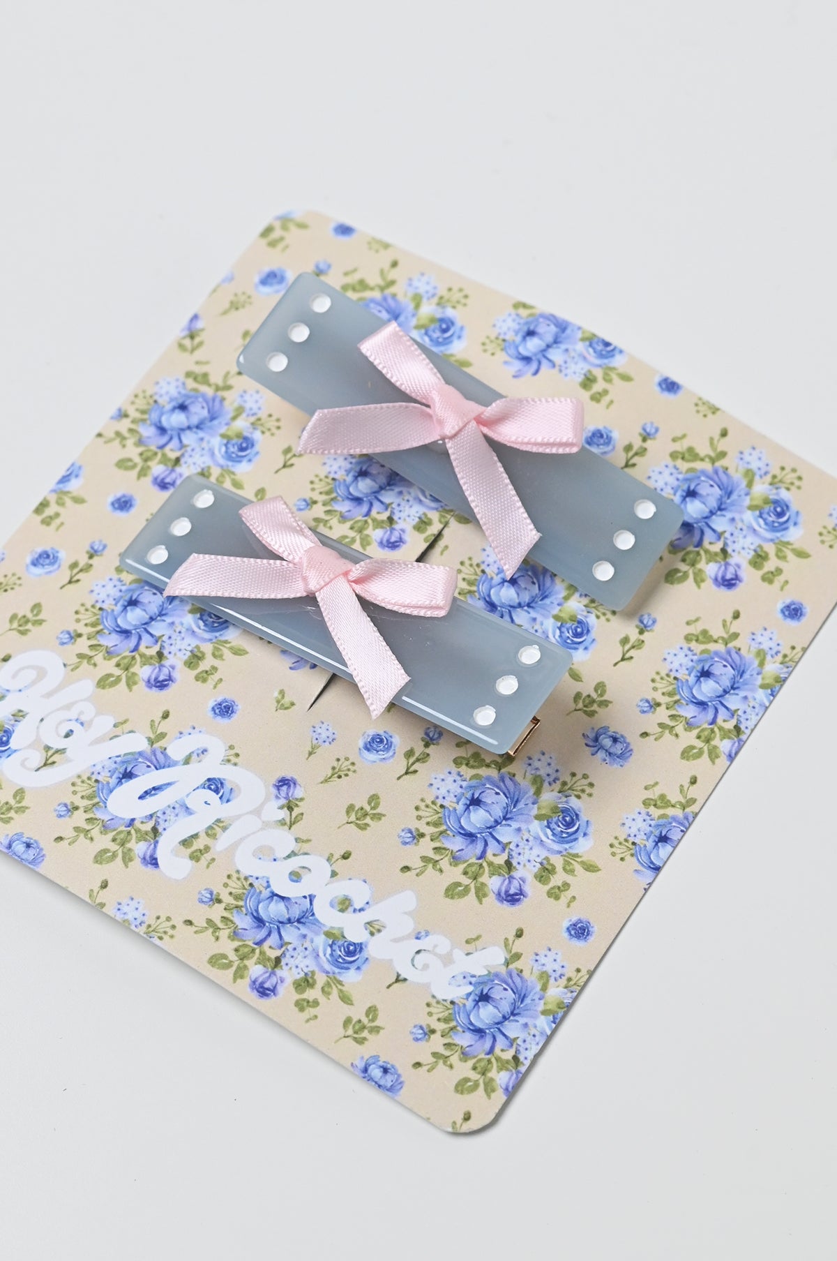 The Grady Twins would approve. This set features 2 small baby blue clips with pink fabric bows and engraved white details on alligator clip closures. Sets open on opposite sides.