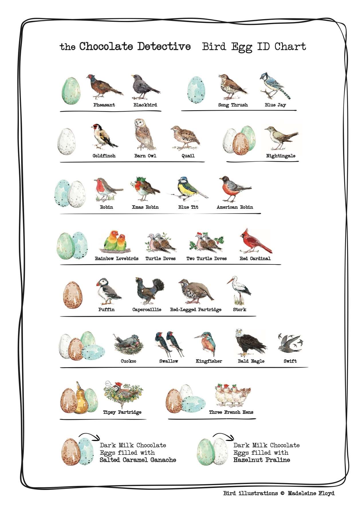 These are the most charming chocolate eggs you will find! A beautifully illustrated box filled with a dozen delicious "Puffin" chocolate eggs, made in France containing mouth-watering buttery salted caramel ganache, with just a touch of fleur de sel in the caramel to intensify the flavour.