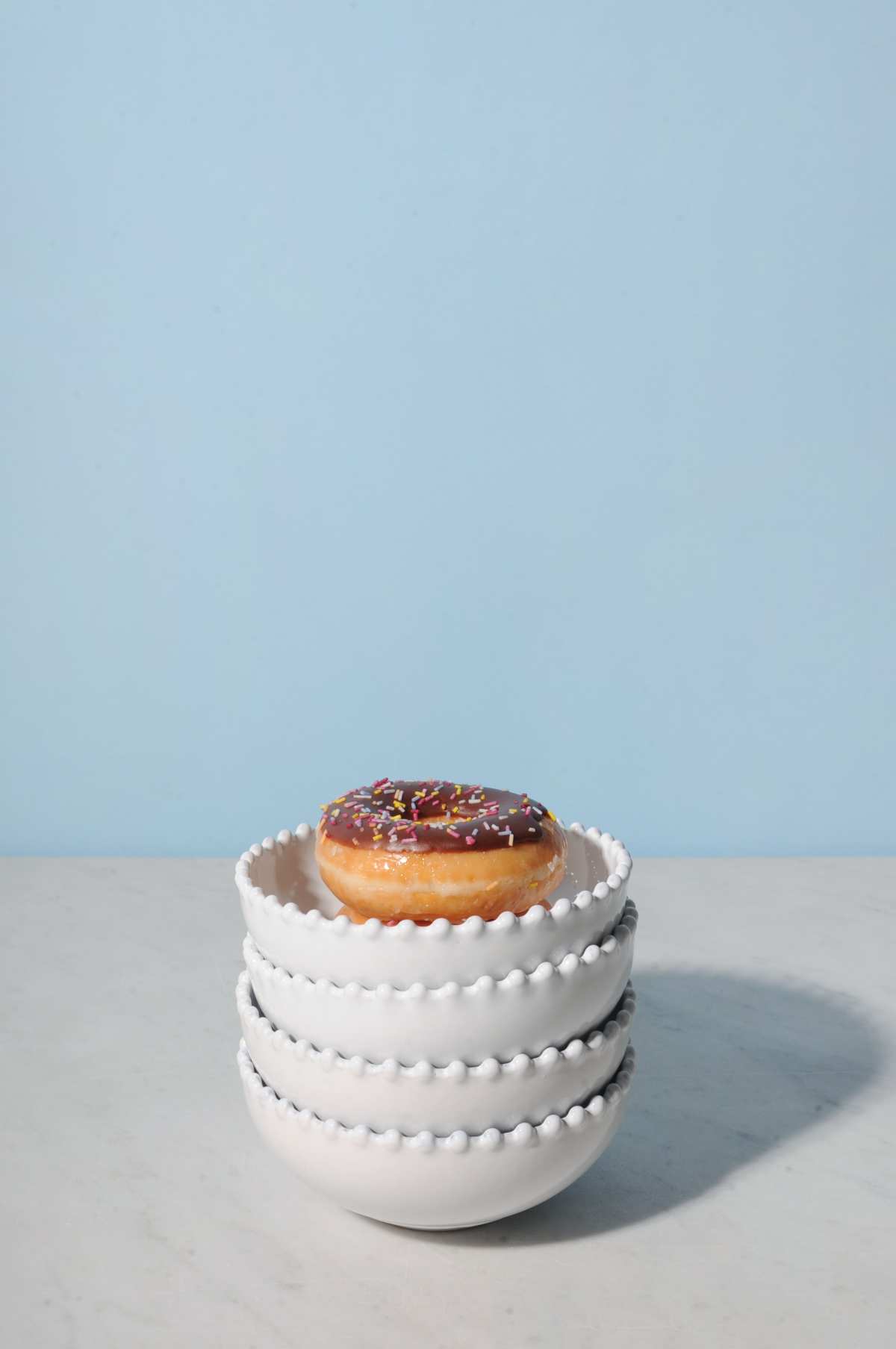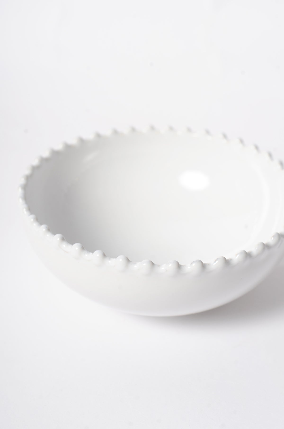This smaller pearl white low sided bowl with beaded edging is a super useful piece on your dinner table and it's perfect for both fancy and everyday use. The Pearl collection was inspired by XVIII and XIX centuries European ceramics.