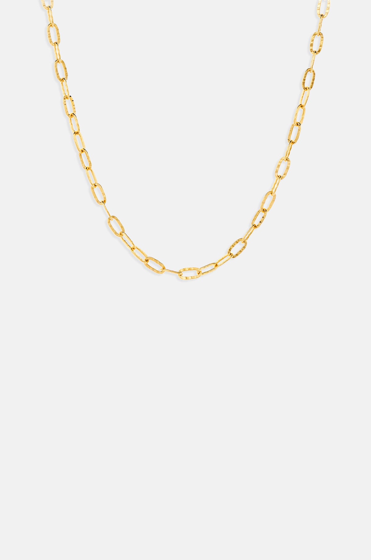 We love a gold chain and the more variety the better. The Alba style has textured rectangular loops with softly curved corners to add a little "chunk" to your necklace layering without losing any femininity.