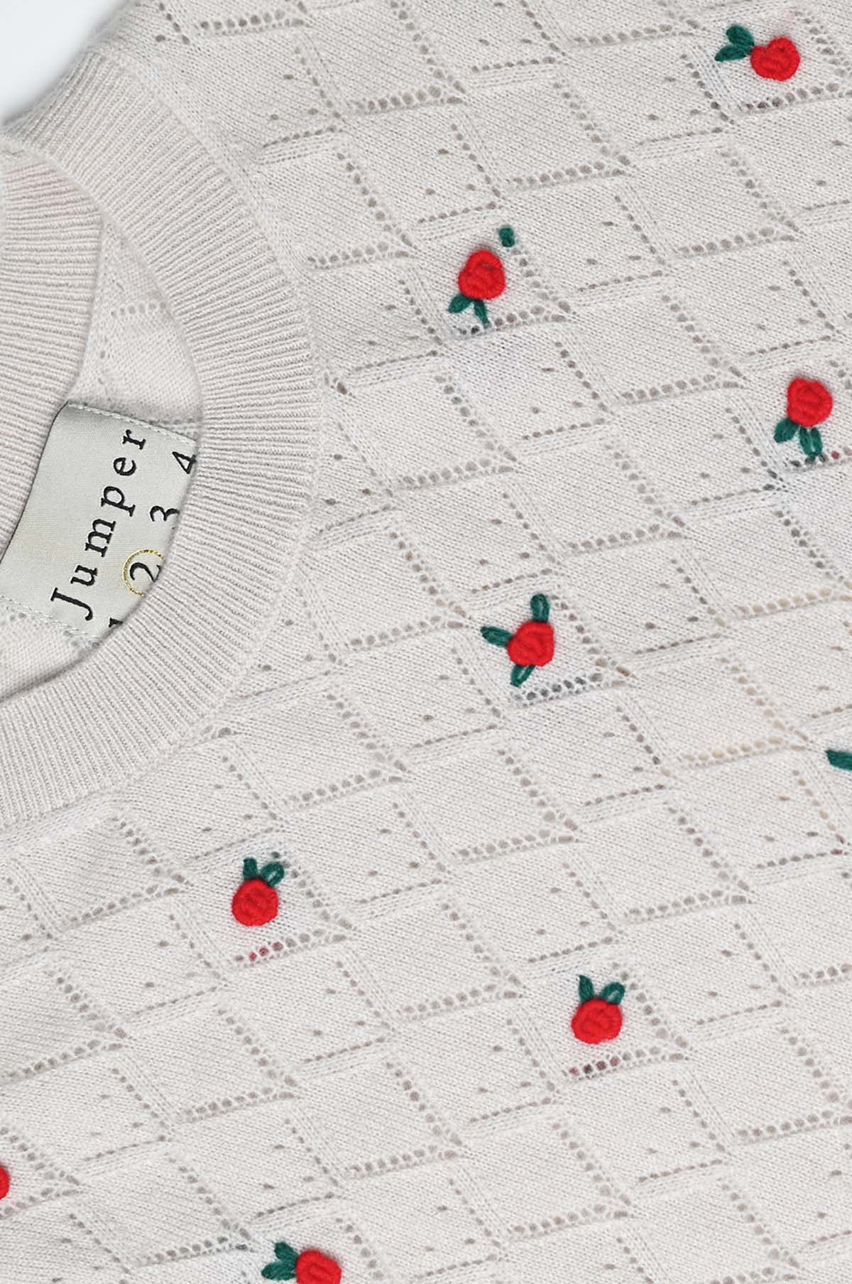 We love Jumper 1234 and we love lightweight knits that make layering up in winter a joy. The Fancy Floral Crew in cream features a fine pointelle repeat diamond pattern and is dotted with small red flowers. Made from the finest cashmere that is irresistibly soft, this is the sweetest knit of the season. Also available in navy.