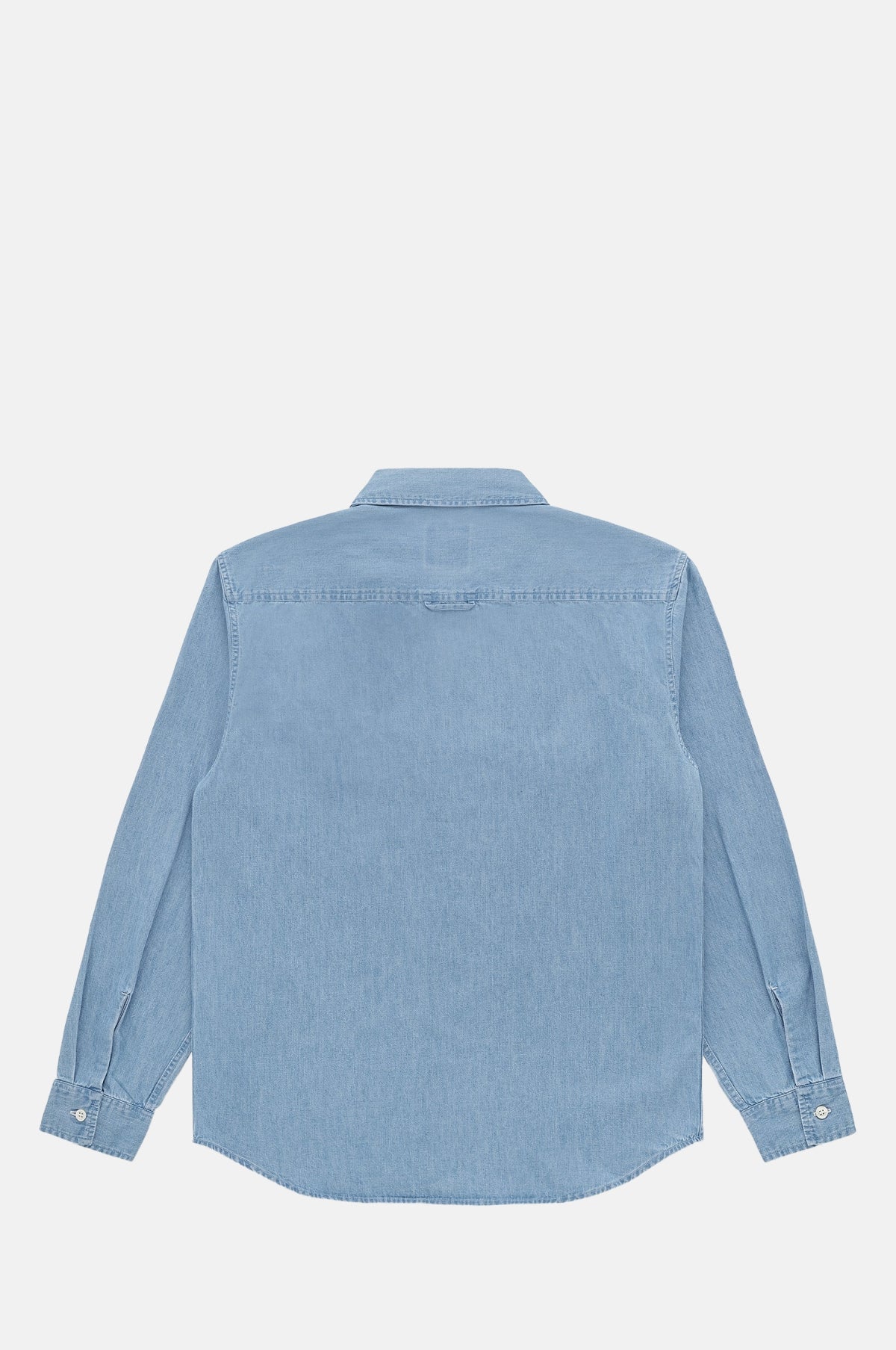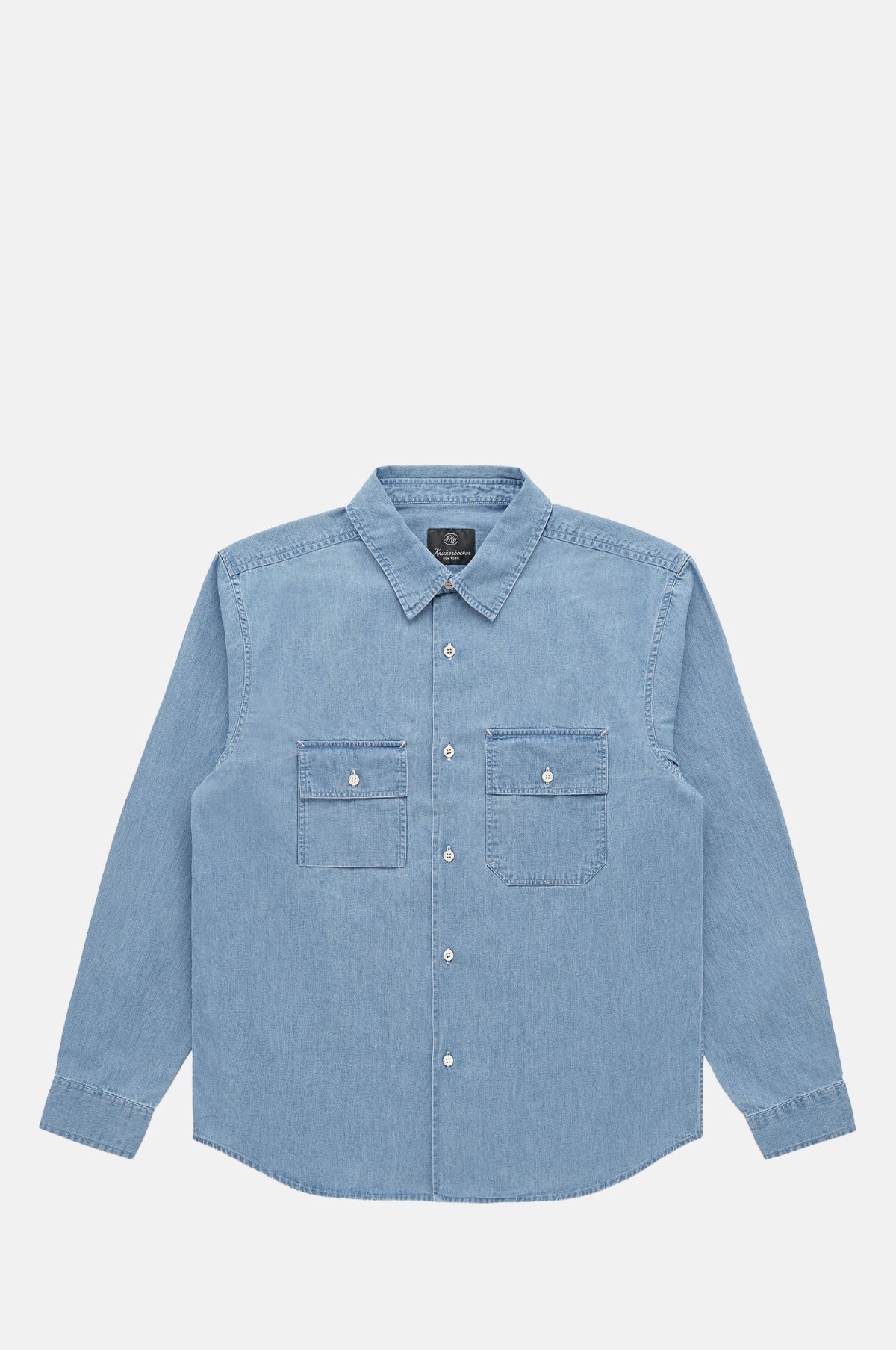 he Pacific Denim Shirt in Light Wash Indigo draws inspiration from classic American workwear. It's built to last with felled-seam construction and bartacks at stress points. Made from lightweight Japanese denim with rope-dyed yarn beautifully over time. tradition and modern style, its finished with clean natural shell buttons instead of melamine or metal.