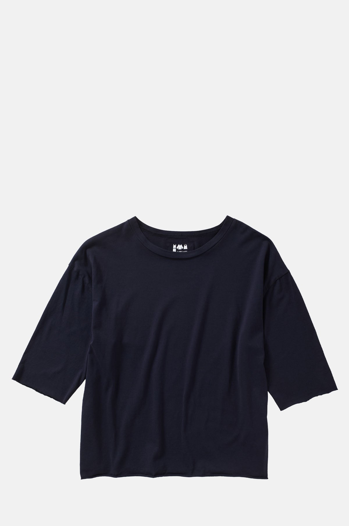 A softly slubbed navy jersey tee that is wonderful to the touch, the Alma Top is a refined staple. Cut to a straight shape with a round neckline, rolled trims and elbow length sleeves which are dropped at the shoulders. Pair with your favourite jeans and trainers for a relaxed off-duty look.