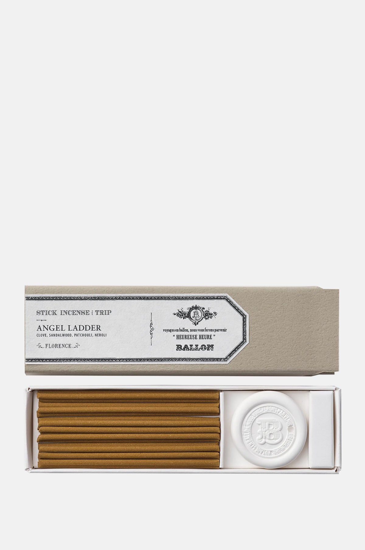 Step into the golden light of Florence with Angel Ladder, a beautifully crafted incense set by Japanese brand Ballon. Part of a collection inspired by four iconic cities, this refined box includes 20 incense sticks and a porcelain stand, designed for both elegance and ease. The fragrance is a luminous composition of clove, sandalwood, patchouli, and neroli — warm, resinous notes lifted by bright citrus florals. A scent that feels timeless yet radiant, like beams of sunlight breaking through Tuscan skies. A moment of quiet luxury, perfect for elevating everyday rituals.