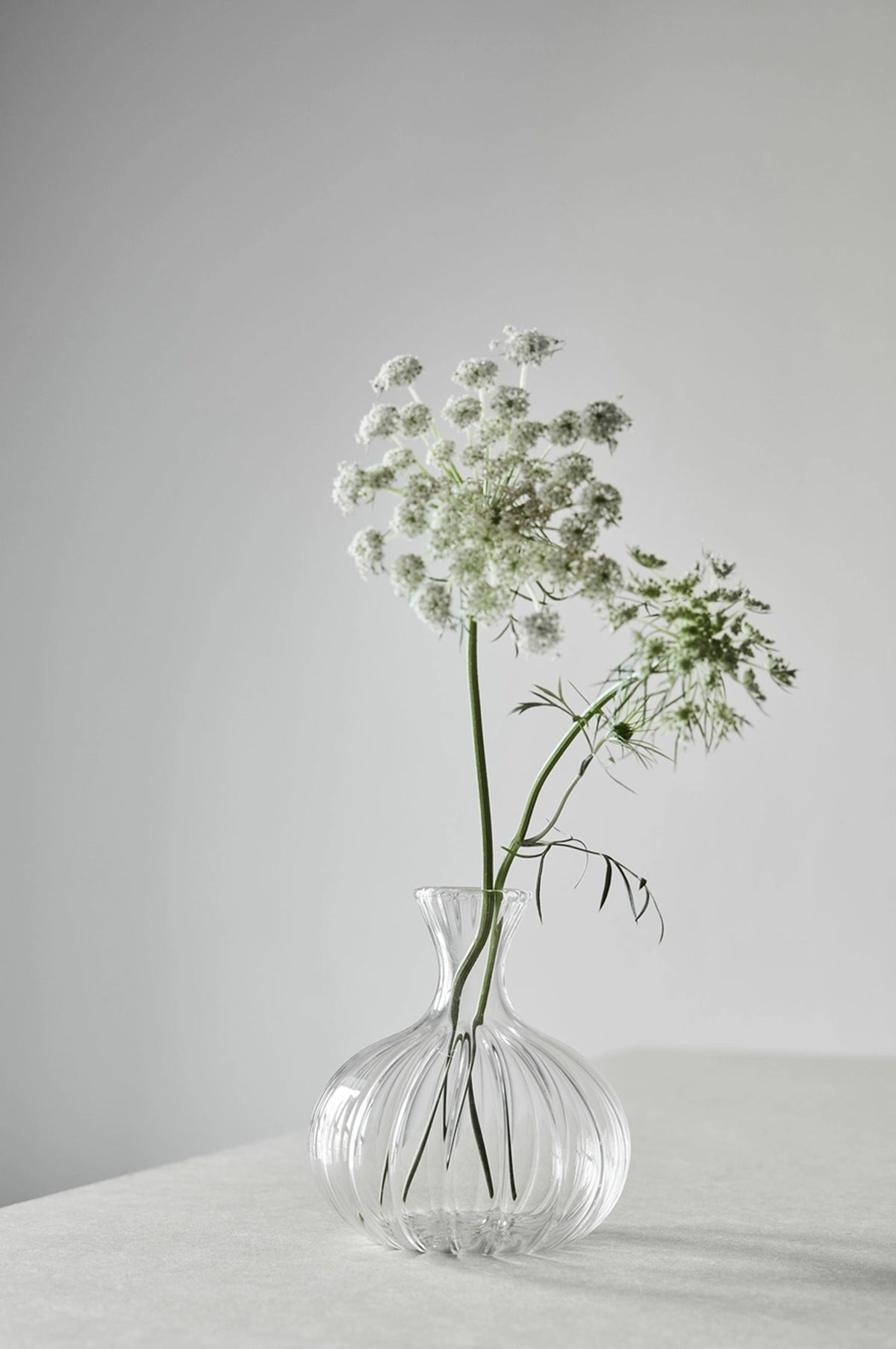 Perfectly proportioned for small cut flowers, this glass bud vase has a classic shape with an elegant long neck. Featuring a joyful ripple design, it is ideal for dotting down a table or as a stand alone piece to make a single stem sing.