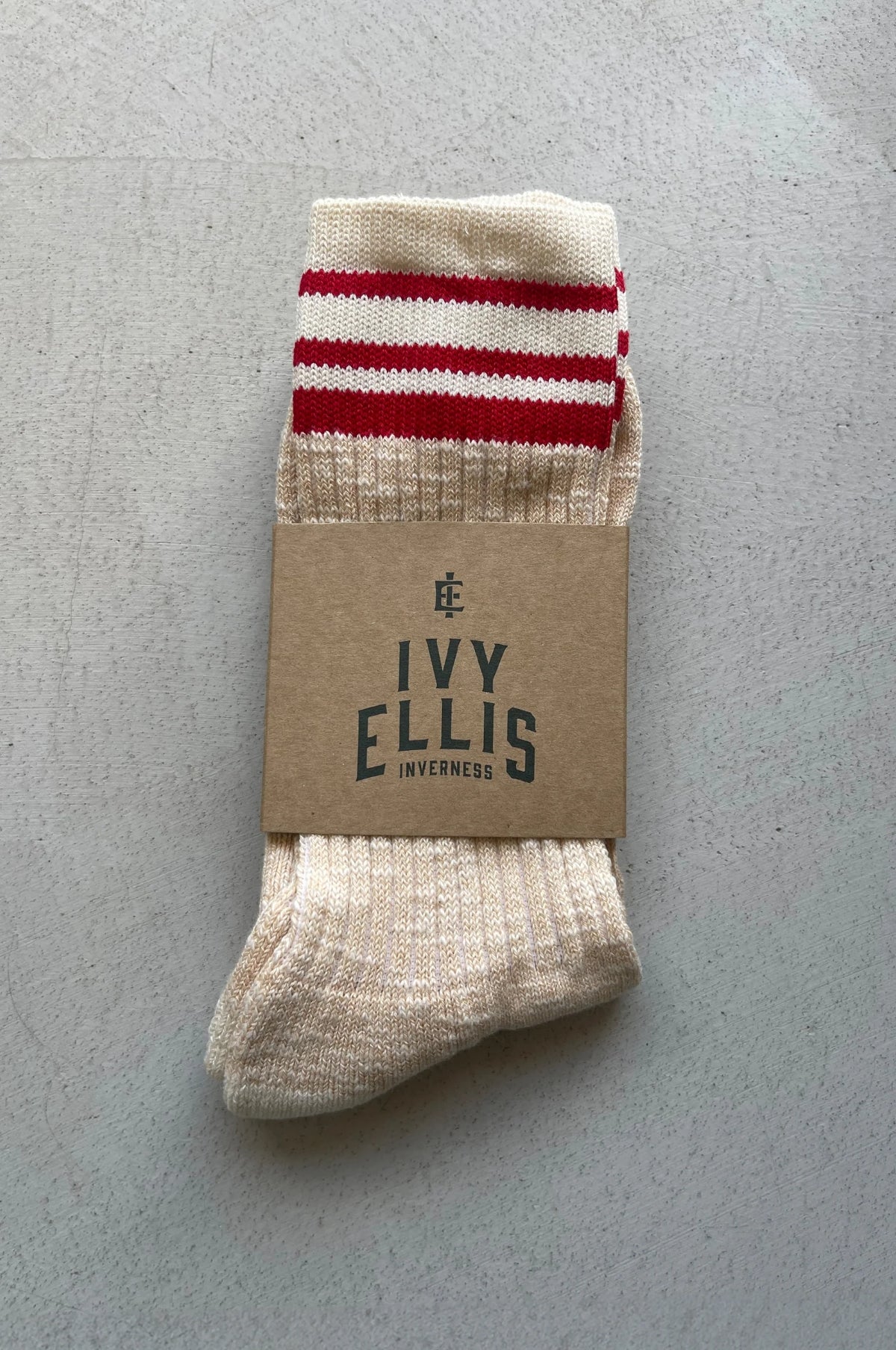 Handcrafted with care, The Torrisdale socks are made from ribbed tan slub yarn, providing a unique texture and visual appeal. Featuring a signature cream heel and toe, these socks are finished with a soft elasticated top with red stripes for extra hold, ensuring they stay in place comfortably throughout the day.