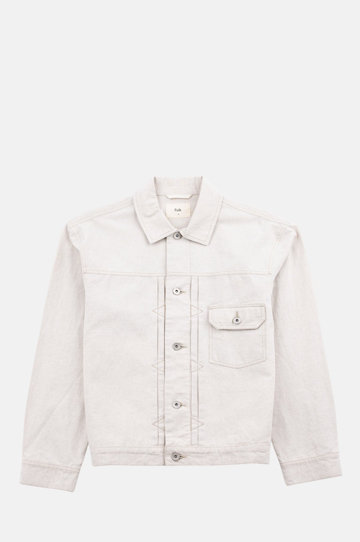 Folk offers style without drama using simple patterns with a focus on quality and textures to create approachable collections enriched by subtle details. The Trucker Jacket from Folk is a boxy fitting jean style jacket with triangular embroidery stitch details. It has been constructed in a linen cotton blend fabric with dry, soft handfeel which has been garment washed to enhance naturally textured character.