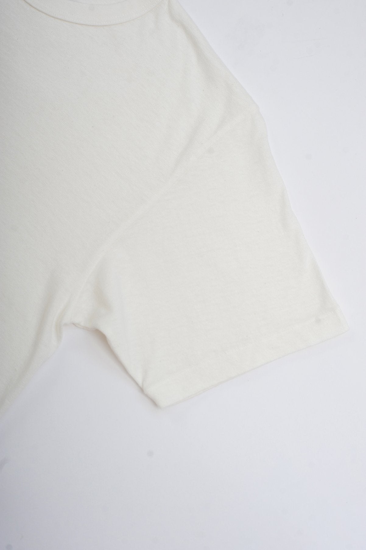 The style is produced on an antique loopwheel knitting machine in Japan (one of 2 left in the world!) and this allows for the tee to have no side seam, whilst the slow knitting process produces no stress on the yarn so it will almost never go out of shape.
