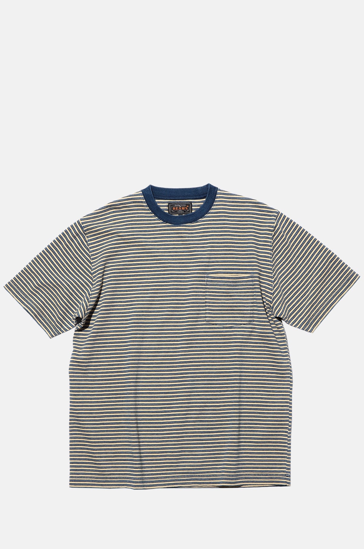 The Beams Plus Pocket Tee Indigo Stripe Off White is a short-sleeved T-shirt featuring a stripe pattern in a timeless silhouette. Made from a mid-weight cotton with a worn in washed feel.