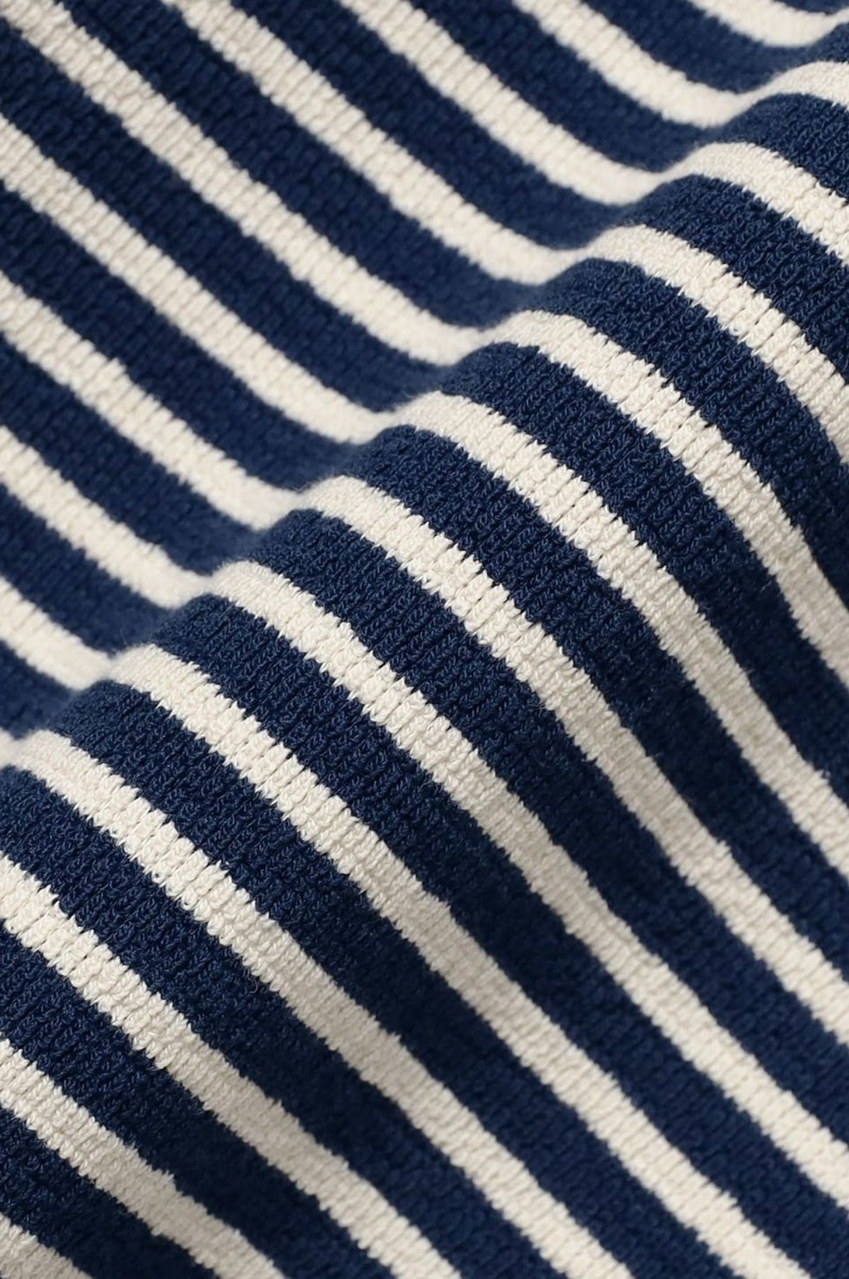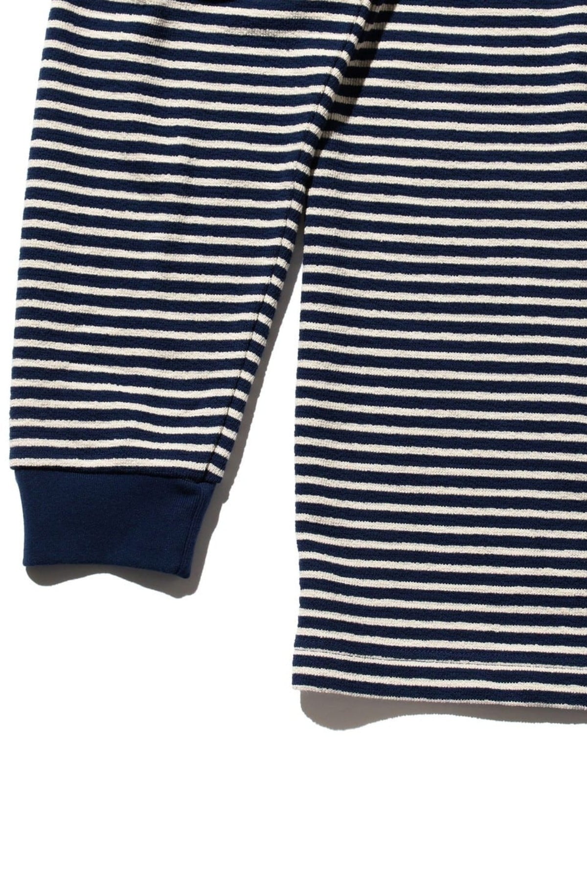 - Long-sleeved tee with narrow navy and white stripe pattern