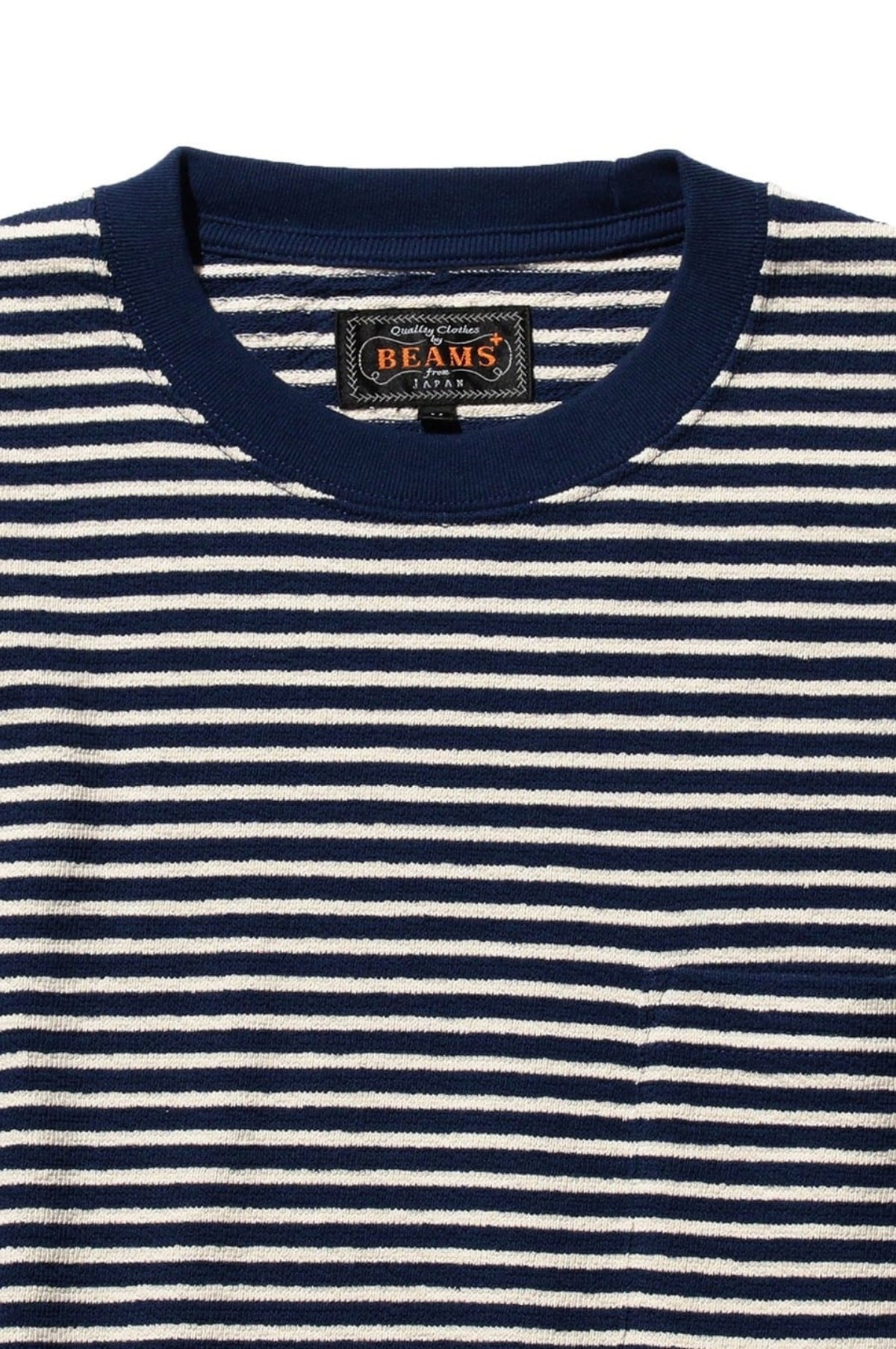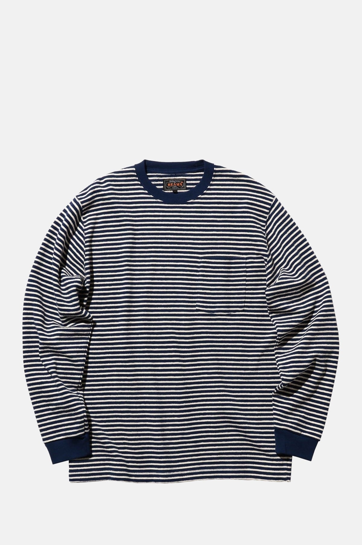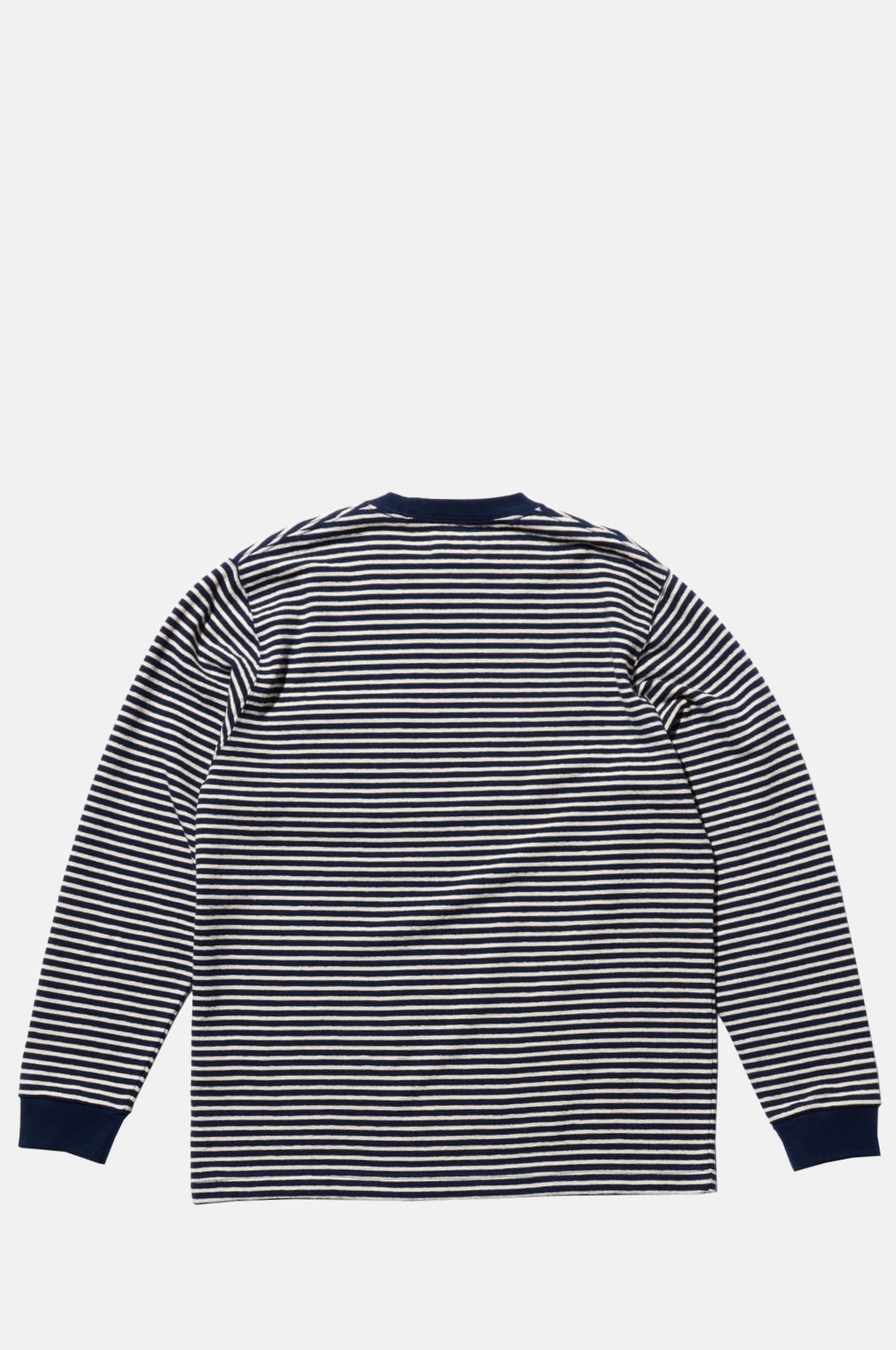 The Beams Plus Pocket Tee Inlay Stripe Navy is a long-sleeved T-shirt featuring a clean, refined stripe pattern in a timeless silhouette. Made from durable 20-count cotton with an inlay knit structure, it offers a soft feel that resists pilling and is suitable for year-round wear. The slightly wider body provides a relaxed yet structured fit, ideal for layering or wearing on its own. With carefully aligned stripes on the chest pocket and matching ribbed details, this BEAMS PLUS piece balances casual comfort with a polished aesthetic.