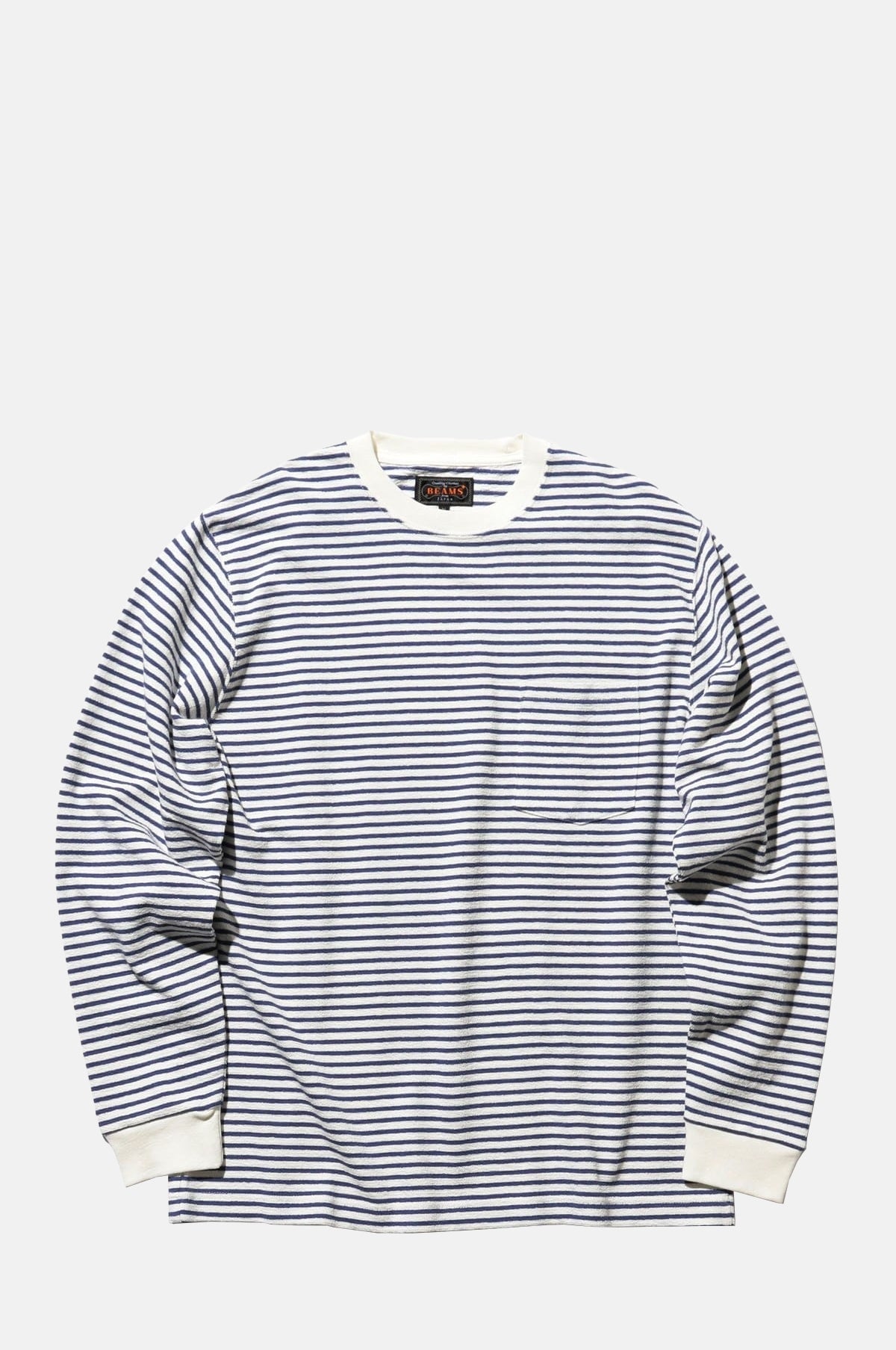The Beams Plus Pocket Tee Inlay Stripe Off White is a long-sleeved T-shirt featuring a clean, refined stripe pattern in a timeless silhouette. Made from durable 20-count cotton with an inlay knit structure, it offers a soft feel that resists pilling and is suitable for year-round wear. The slightly wider body provides a relaxed yet structured fit, ideal for layering or wearing on its own. With carefully aligned stripes on the chest pocket and matching ribbed details, this BEAMS PLUS piece balances casual comfort with a polished aesthetic.