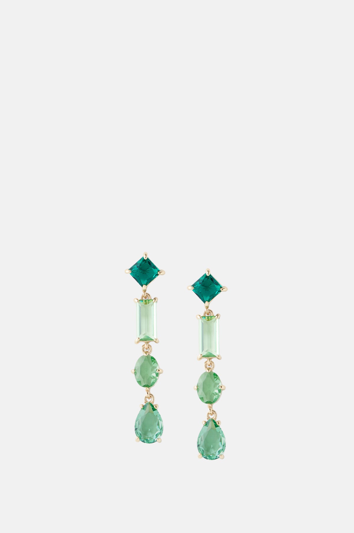 An ideal addition to evening wear, these drop earrings bring just the right amount of drama to your look. Layered gems in soft green hues and sculptural shapes dangle from an emerald stud. The elegant glass cuts are set in 14K gold plating.