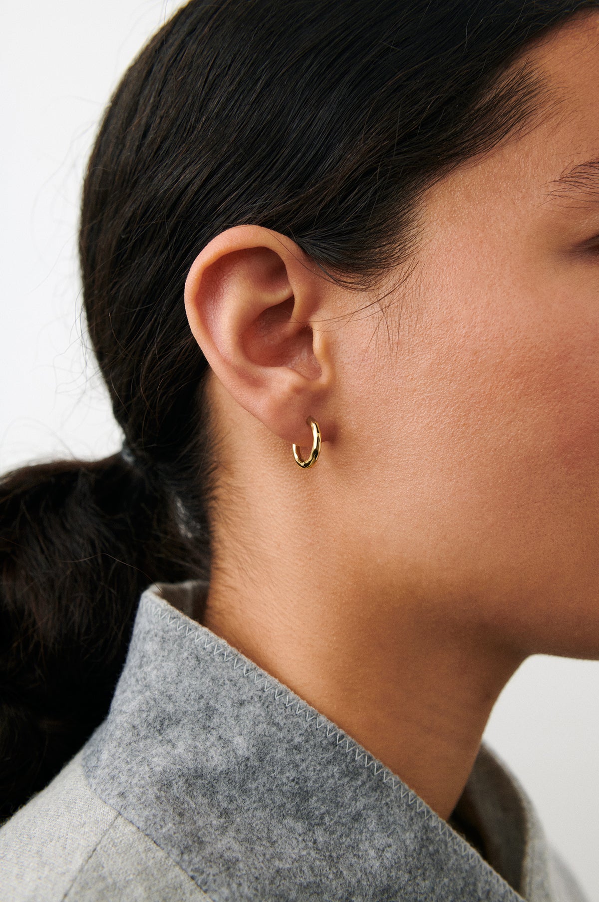 Spirit Huggies are a pair of small, elegant huggie earrings featuring soft, flowing curves that beautifully frame the edges. The gentle shapes reflect the light in a vibrant way, creating a unique surface that makes the earrings both stylish and eye-catching. Great for everyday wear.