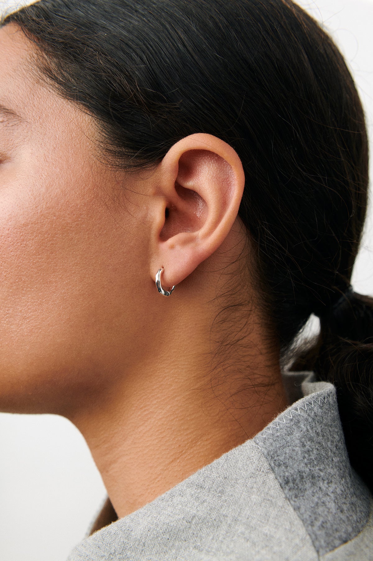 Spirit Huggies are a pair of small, elegant huggie earrings featuring soft, flowing curves that beautifully frame the edges. The gentle shapes reflect the light in a vibrant way, creating a unique surface that makes the earrings both stylish and eye-catching. Great for everyday wear.