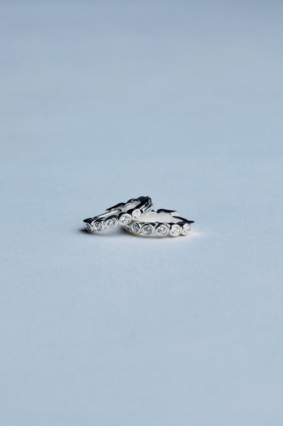A pair of silver hoops with a string of shiny white brilliant-cut CZ stones going from the front of the ear and ending behind the ear. Classic and elegant.