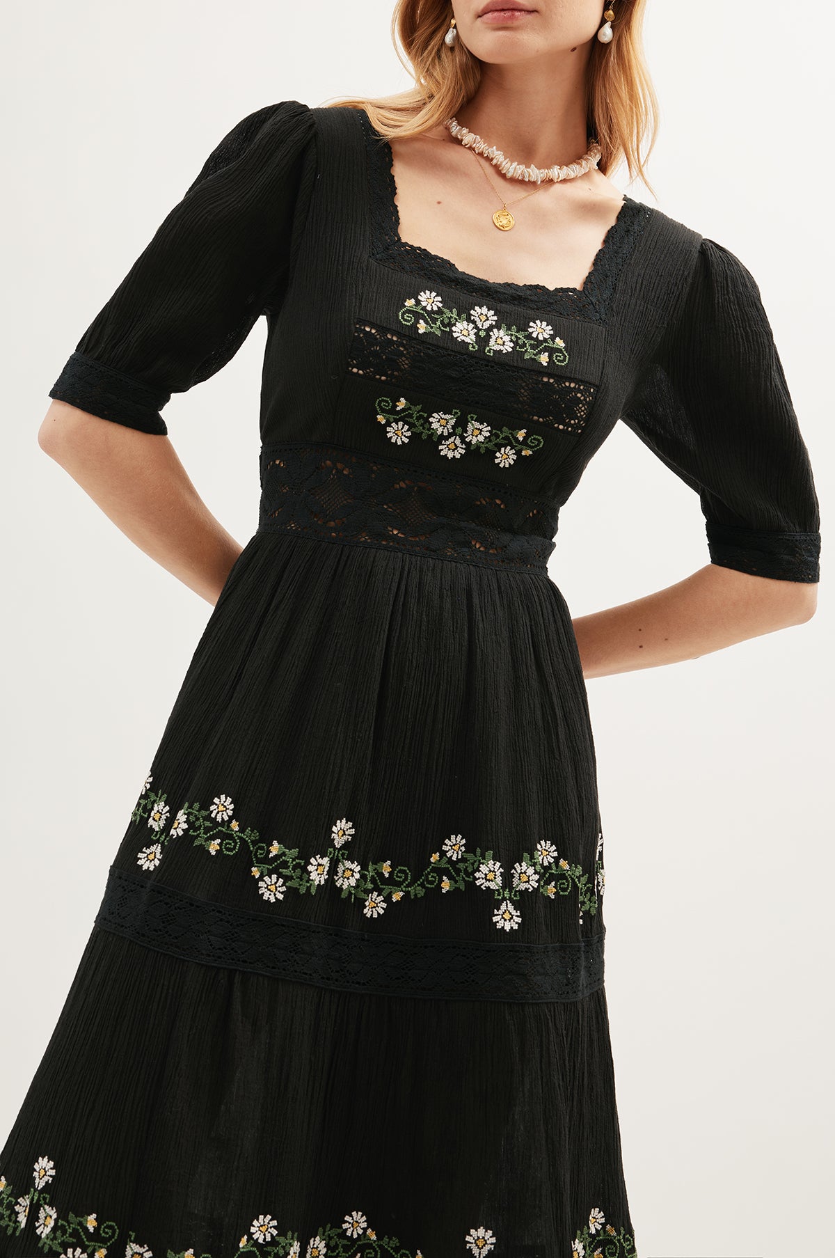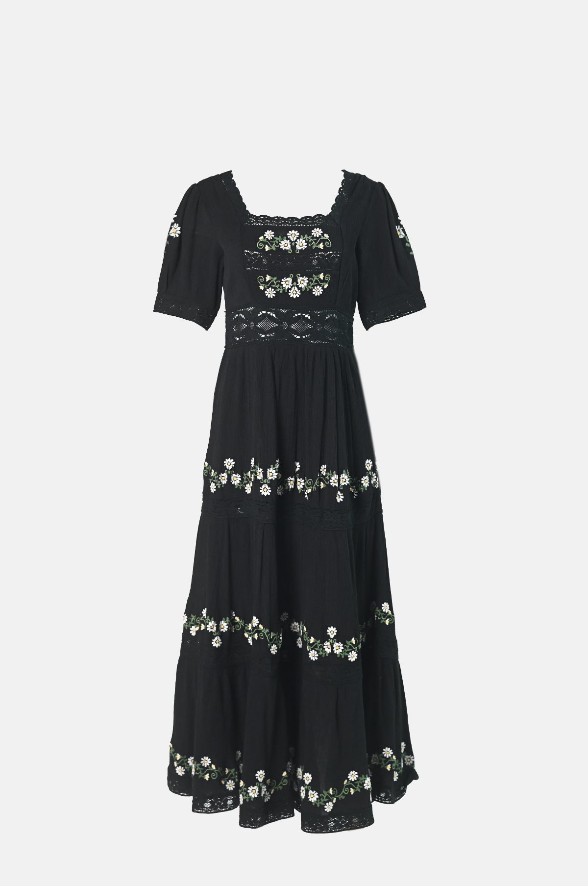 The Philippa Dress in black from Rixo is vintage-inspired and offers a soft shape that is enhanced by its crepe fabric, generous maxi-length and short, puffed sleeves. With tiered floral embroidery and repeating lace inserts, this dress has artisanal charm and timeless elegance.