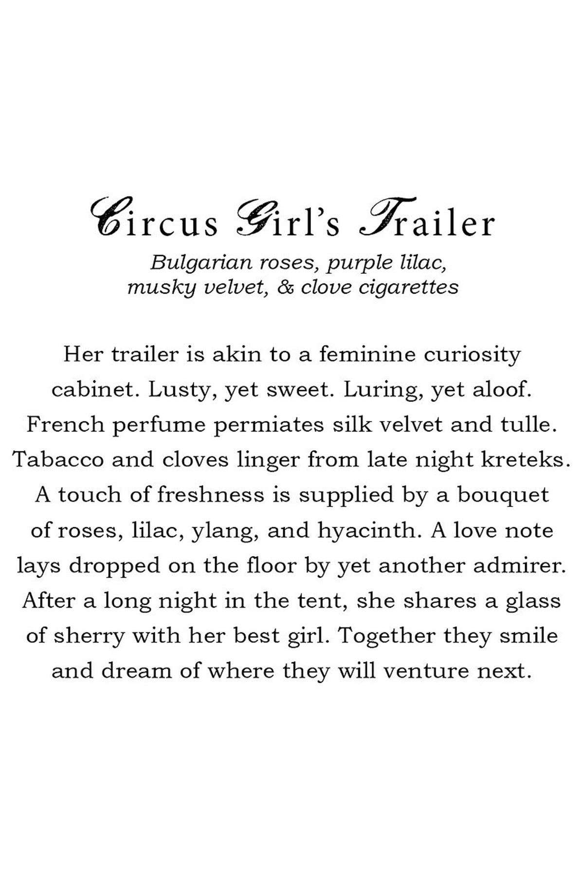 Circus Girl's Trailer smells like French perfume permeated through silk, velvet and tulle. Hints of Bulgarian roses, purple lilac, musky velvet and clove cigarettes are dominant throughout this candle.