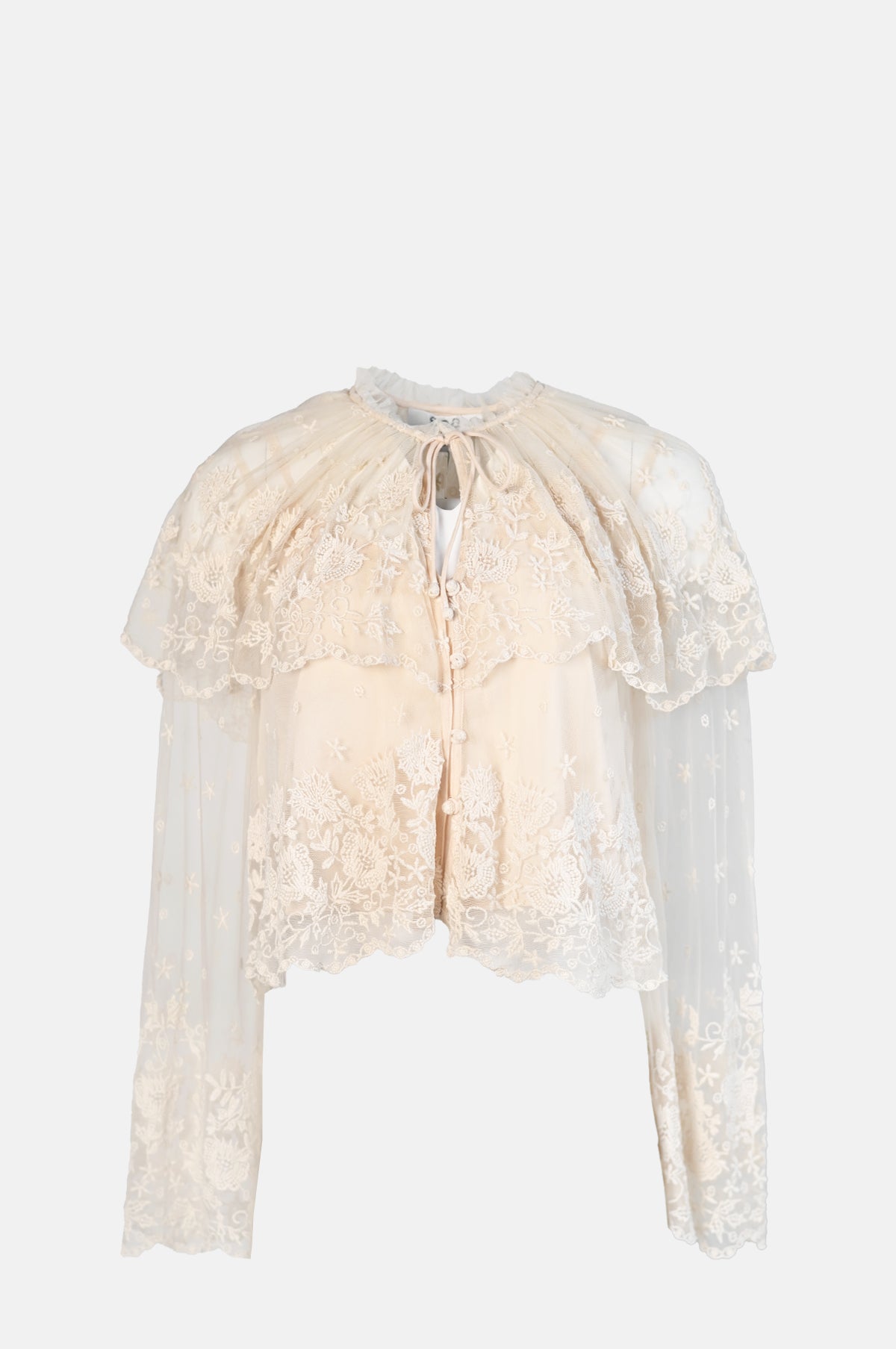 Evoking ethereal and feminine charm, the Bronte embroidered top is crafted from sheer, embroidered mesh and features a romantic capelet overlay, long flowing sleeves, and a front tie closure. With an airy silhouette and intricate floral detailing, it has us dreaming of hot summer days in the English countryside.