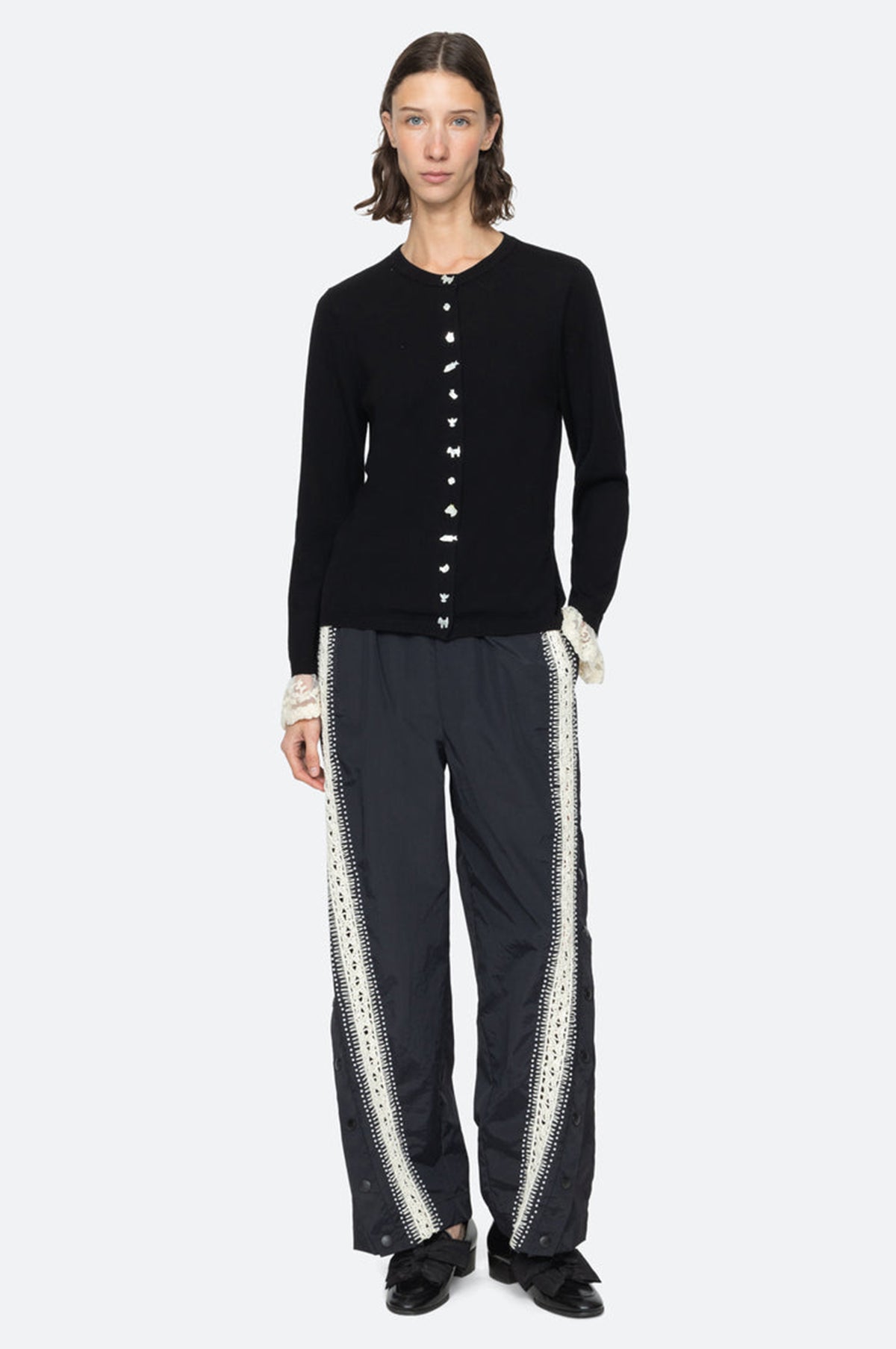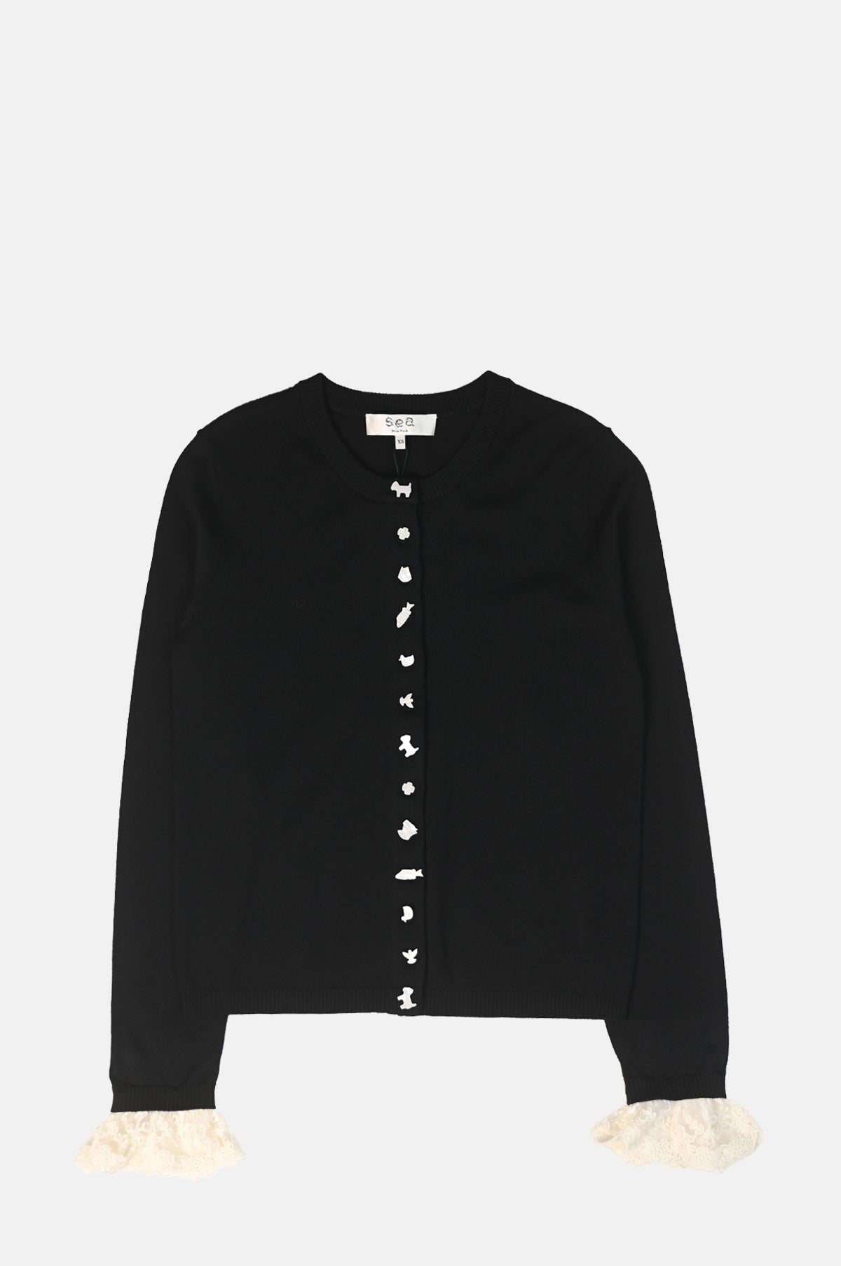 A black cardigan is a staple in everyone's wardrobe and this one from Sea New York makes a case for having a second rather special one. Featuring intricate folkloric-inspired pearlescent buttons and detachable lace cuffs it combines artisanal charm with versatile elegance.