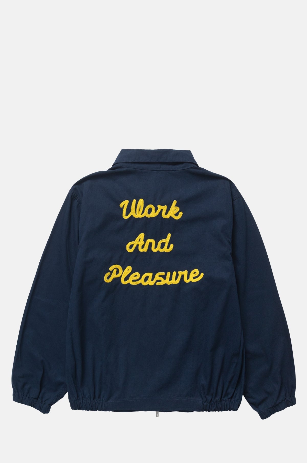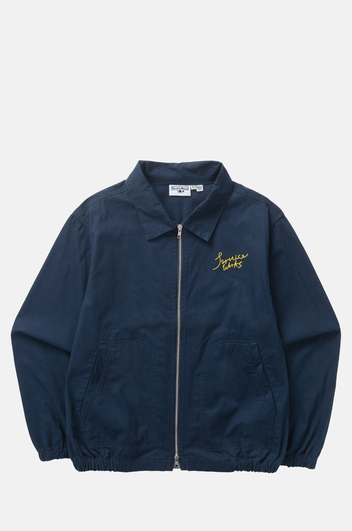 Designed for Chefs, adapted for all. Service Works offer functional clothing that originally started as uniforms for restaurants in London but now serves as the ideal everyday wear. The Twill Work Jacket is a new addition to the Service Works arsenal, based on classic garage jacket style it features a simple zip closure, regular collar and a chain stitched embroidery design on the left chest and back.