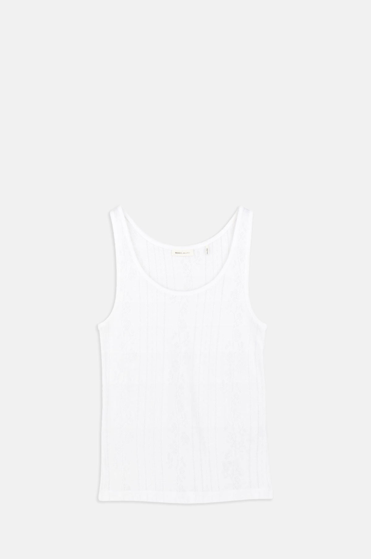 A comfortable and soft cotton tank top from Skall Studios, we adore the fresh white colour making this a great neutral piece that can be layered or worn on its own. It has a round neck with a pretty floral pointelle texture. We are pairing ours with cream jeans and a barn jacket.