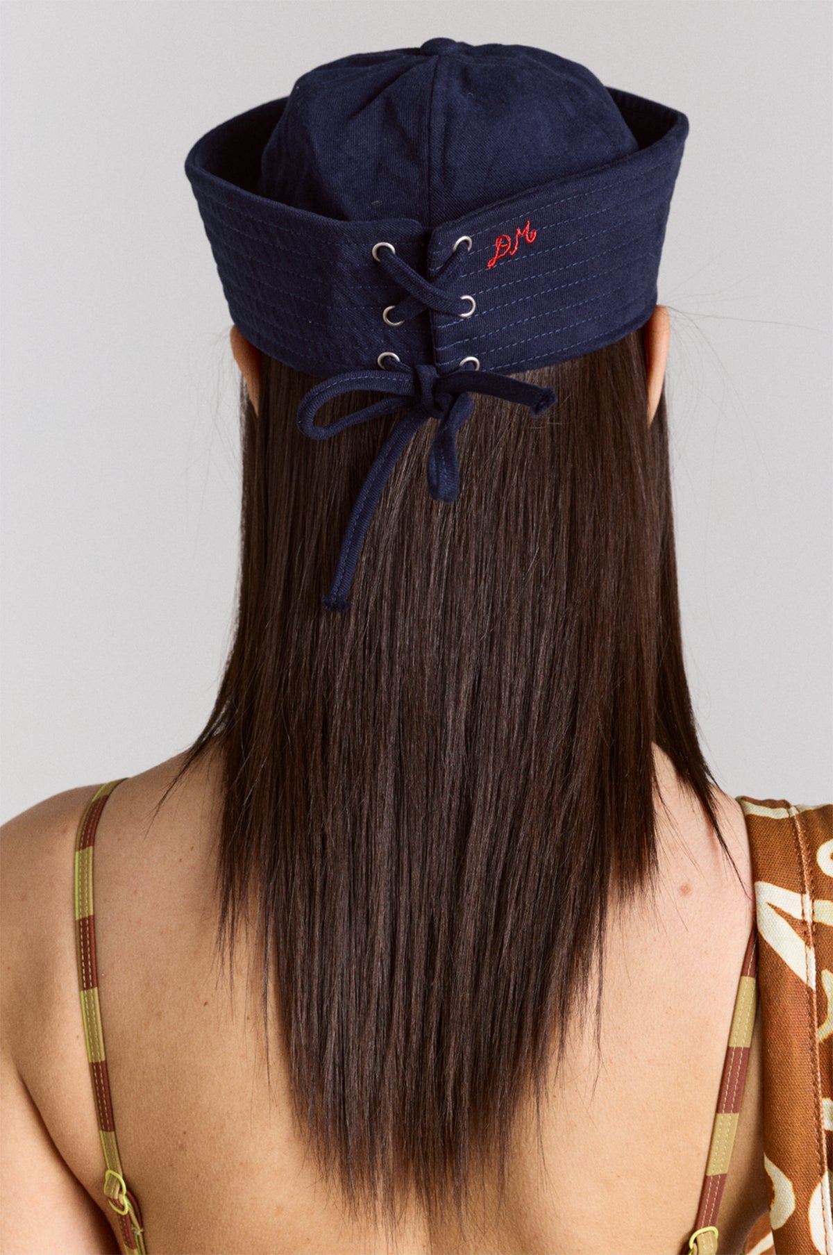 Meet the Cotton Sailor Hat in navy from Damson Madder, a timeless silhouette with a playful twist. Crafted from 100% recycled cotton, this classic sailor-style hat features a fold-up brim, eyelet and tie details at the back, and contrast red 'DM' embroidery for a subtle pop against deep navy.