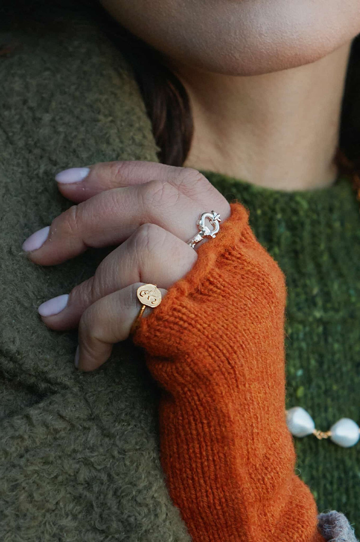 A weathered token imprinted with an anchor creates a sweet stacking ring, inspired by exploring and mudlarking on the shores of a river, and discovering things that tell tales from another time.