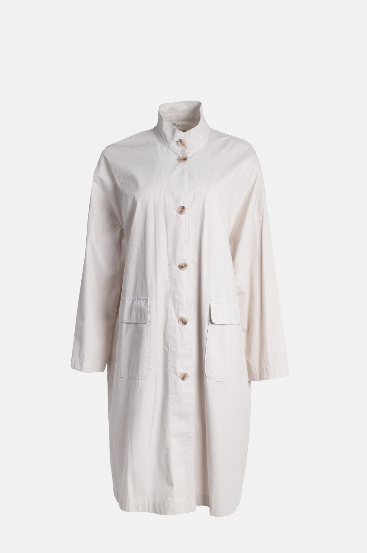 Enduring in style, the Valor coat from Hartford is a quintessential trench made from a lightweight cotton blend. The Valor is single breasted and features a collarless design with dropped shoulders, two front flap pockets and six button closure. A lightweight layer, this stone coloured coat is perfect for transitional dressing.
